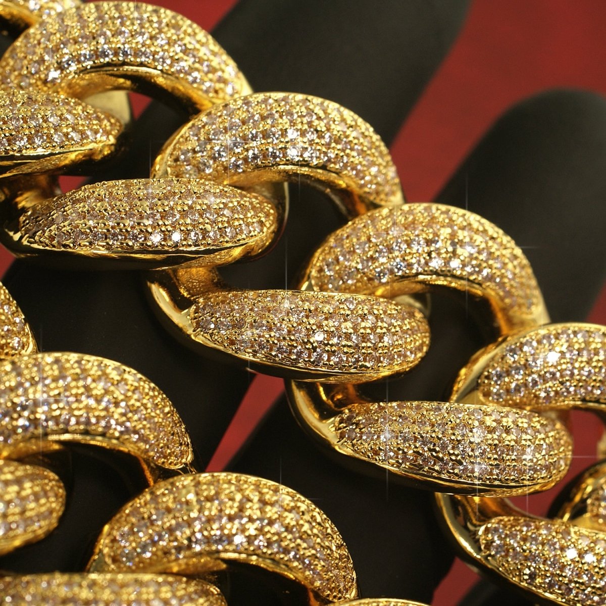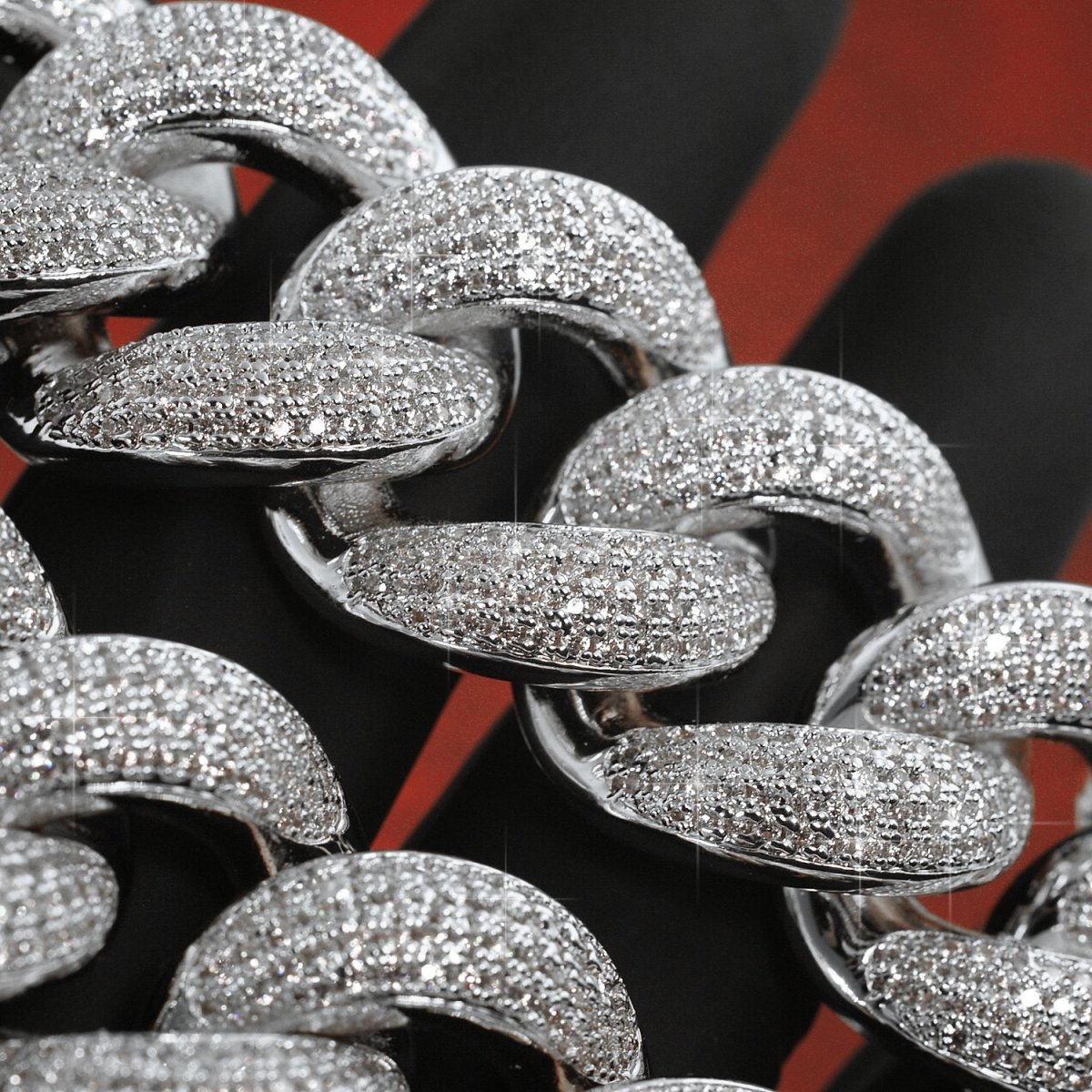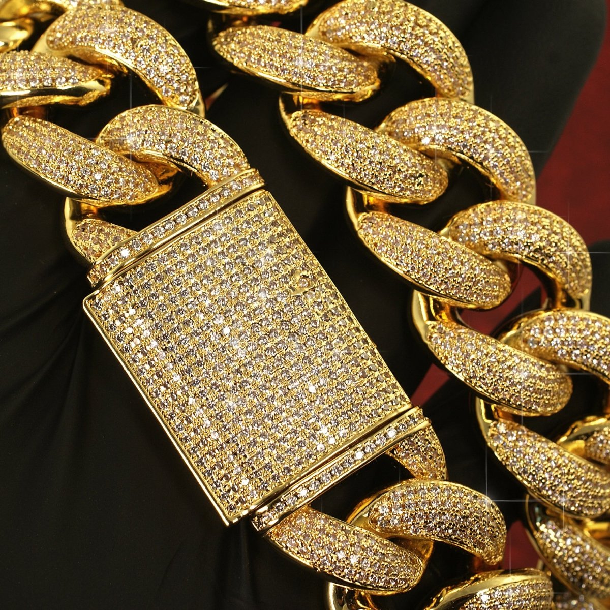 This high quality chain is hand made exactly like high end diamond jewelry. 4 rows of small sized VVS clarity simulated diamonds are hand set on every link. This chain is fully solid, not hollowed out in the back like cheap fakes. This thing is half a kilo even on the shortest length. It's finished off with a proper oversized box clasp. Every detail you expect from a $100,000+ diamond cuban.