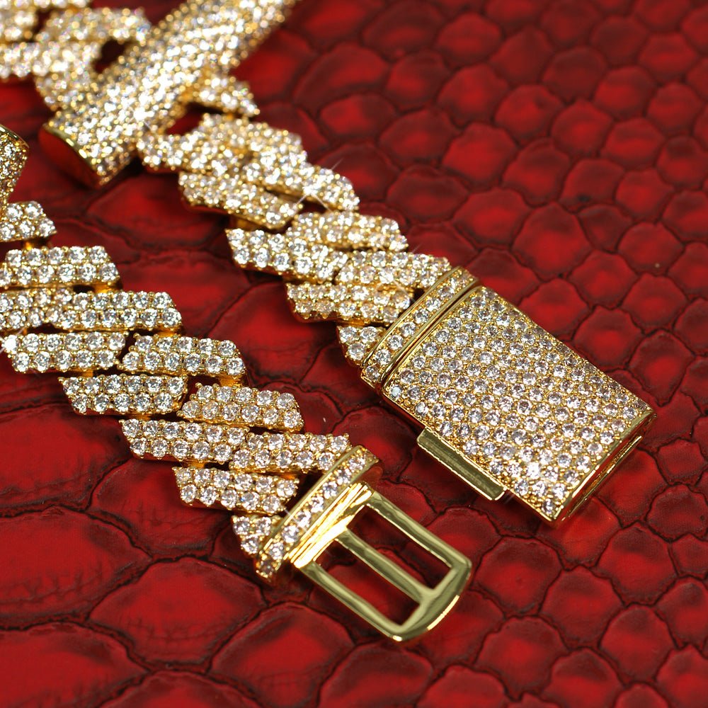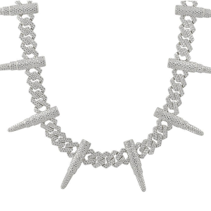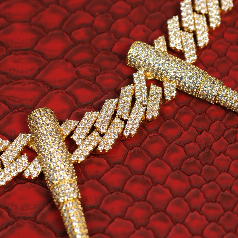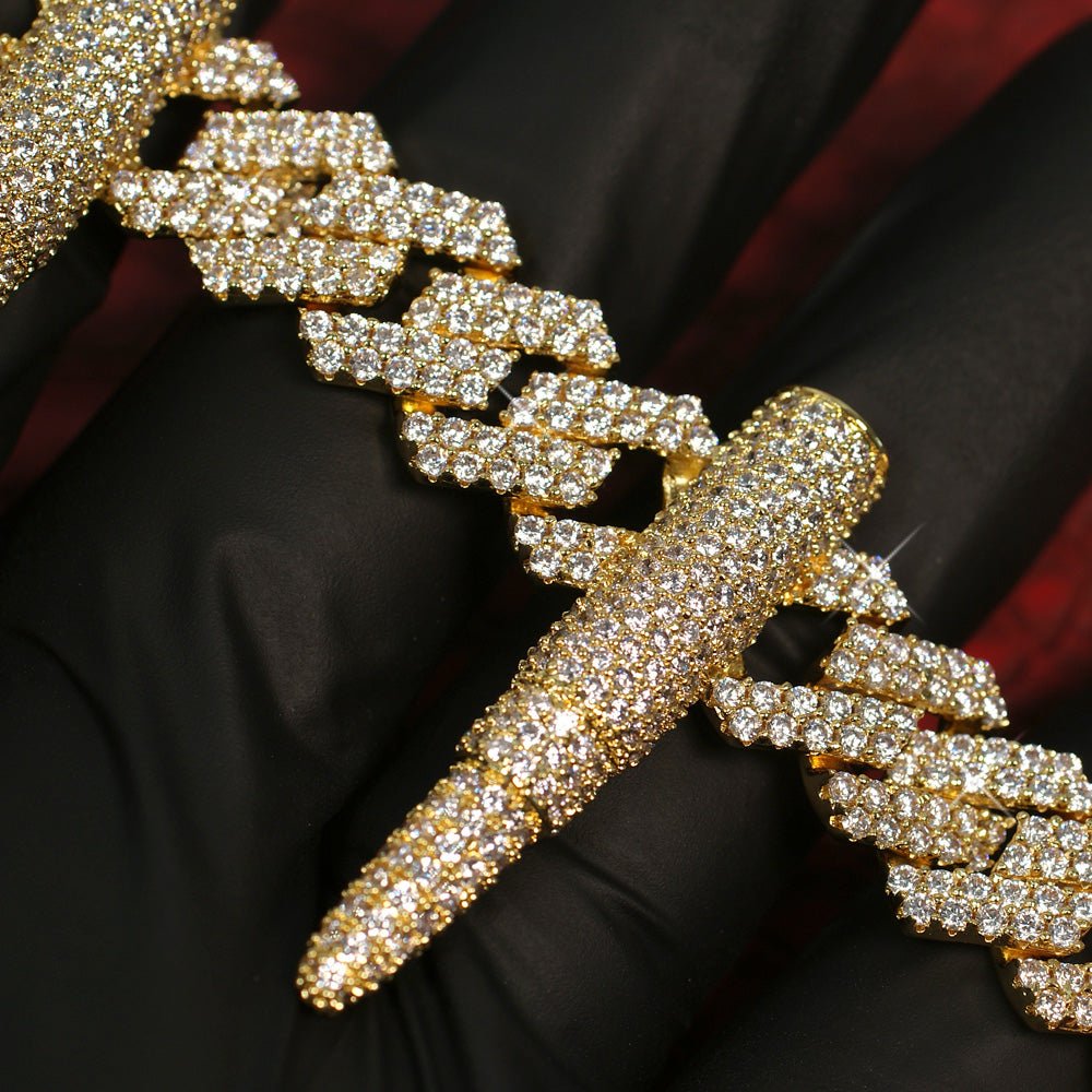 Kill the game with the most unique cuban chain made. This chain has 7.62 style bullet casings flooded out in glistening ice throughout. The chain is finished with our exclusive fold-over box clasp that's strong and easy to use. Order today and rock this in just a few days!