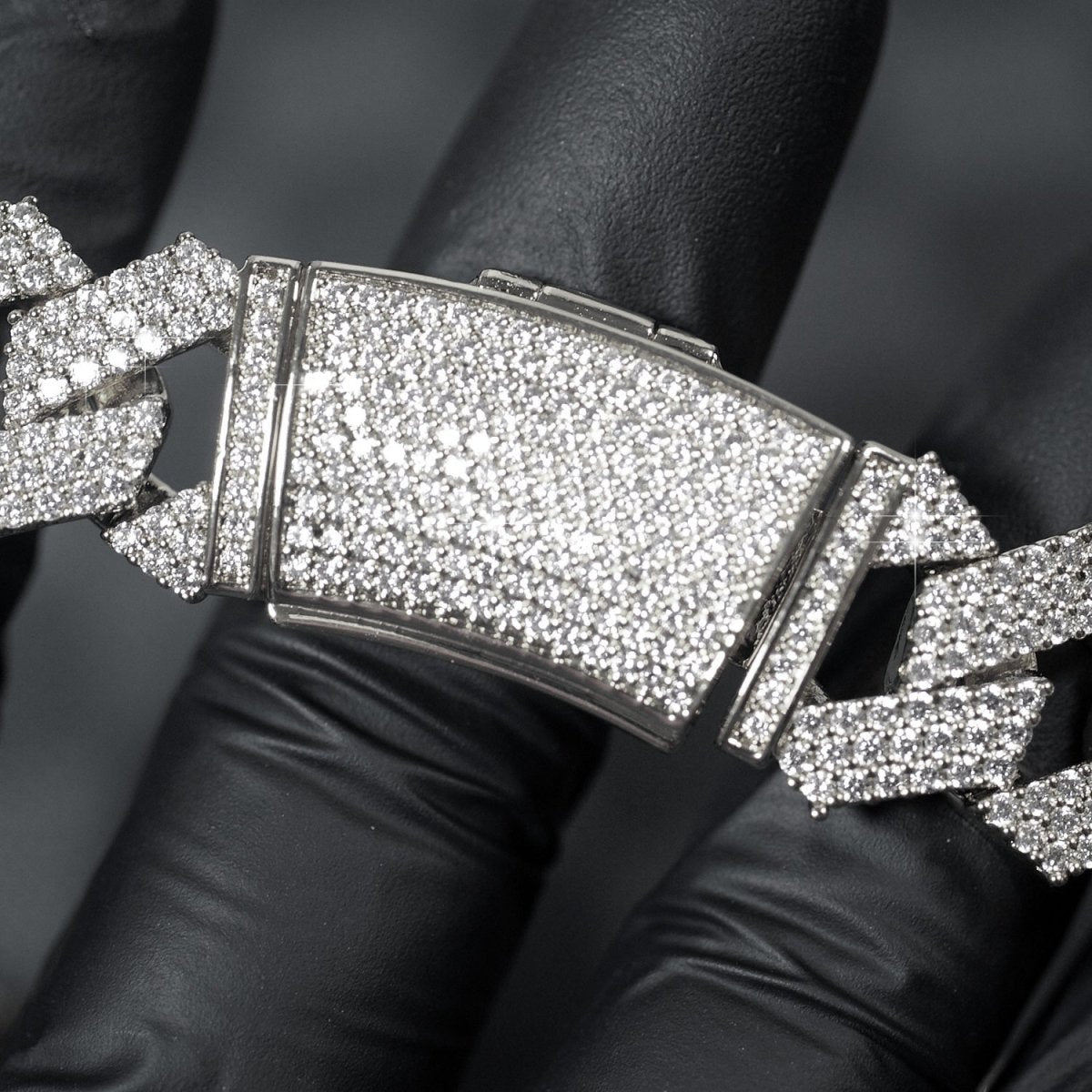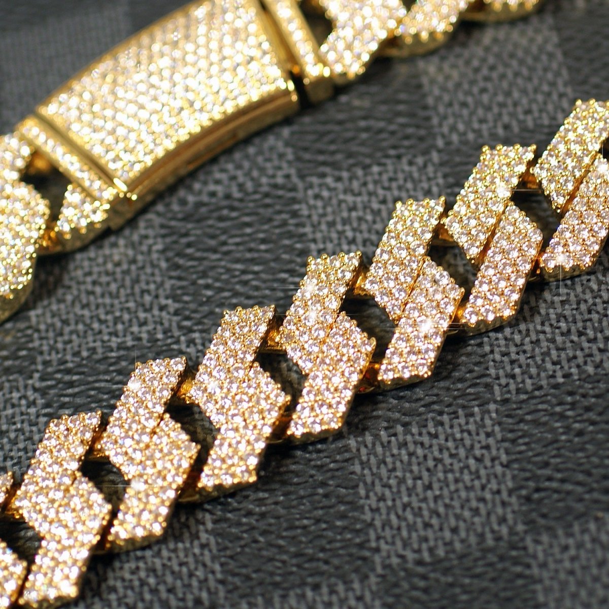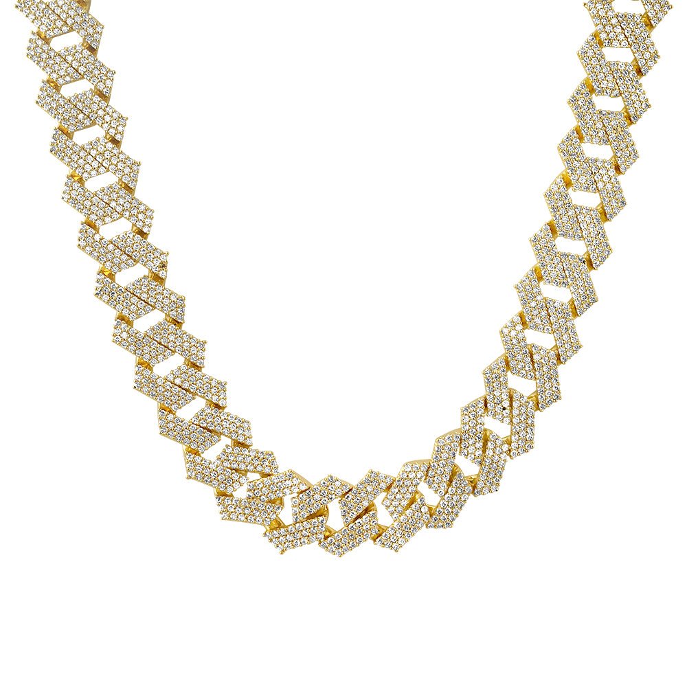 Big boy alert! This large chain will turn heads everywhere you go. It features modern looking flat straight edge cuban links that are completely iced out with 6 rows of tight pave stone setting. These are the highest grade simulated diamonds, with the exact same cut and polishing methods used on natural diamonds. This chain will reflect light in the same manner as expensive natural diamonds. The heavy brass material is coated with thick rhodium or gold plating, to give you the exact look and feel of gold without costing $30,000+. Get yours today!
