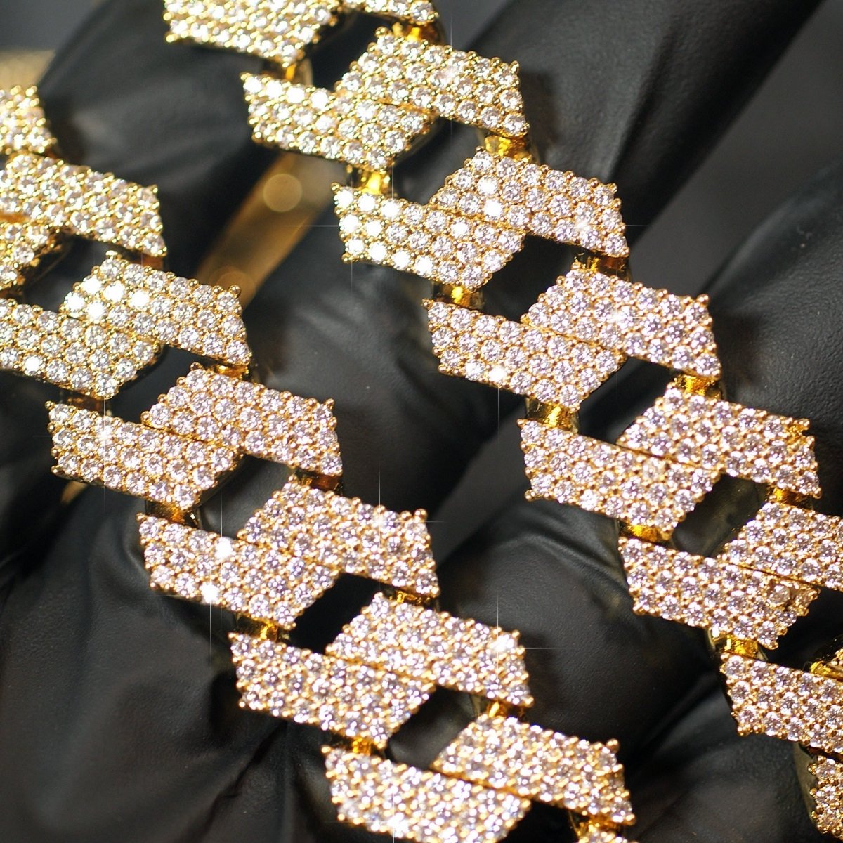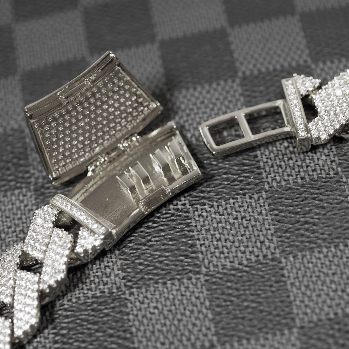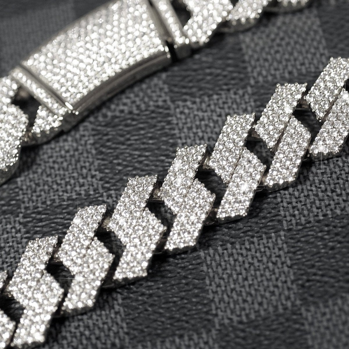 Big boy alert! This large chain will turn heads everywhere you go. It features modern looking flat straight edge cuban links that are completely iced out with 6 rows of tight pave stone setting. These are the highest grade simulated diamonds, with the exact same cut and polishing methods used on natural diamonds. This chain will reflect light in the same manner as expensive natural diamonds. The heavy brass material is coated with thick rhodium or gold plating, to give you the exact look and feel of gold without costing $30,000+. Get yours today!