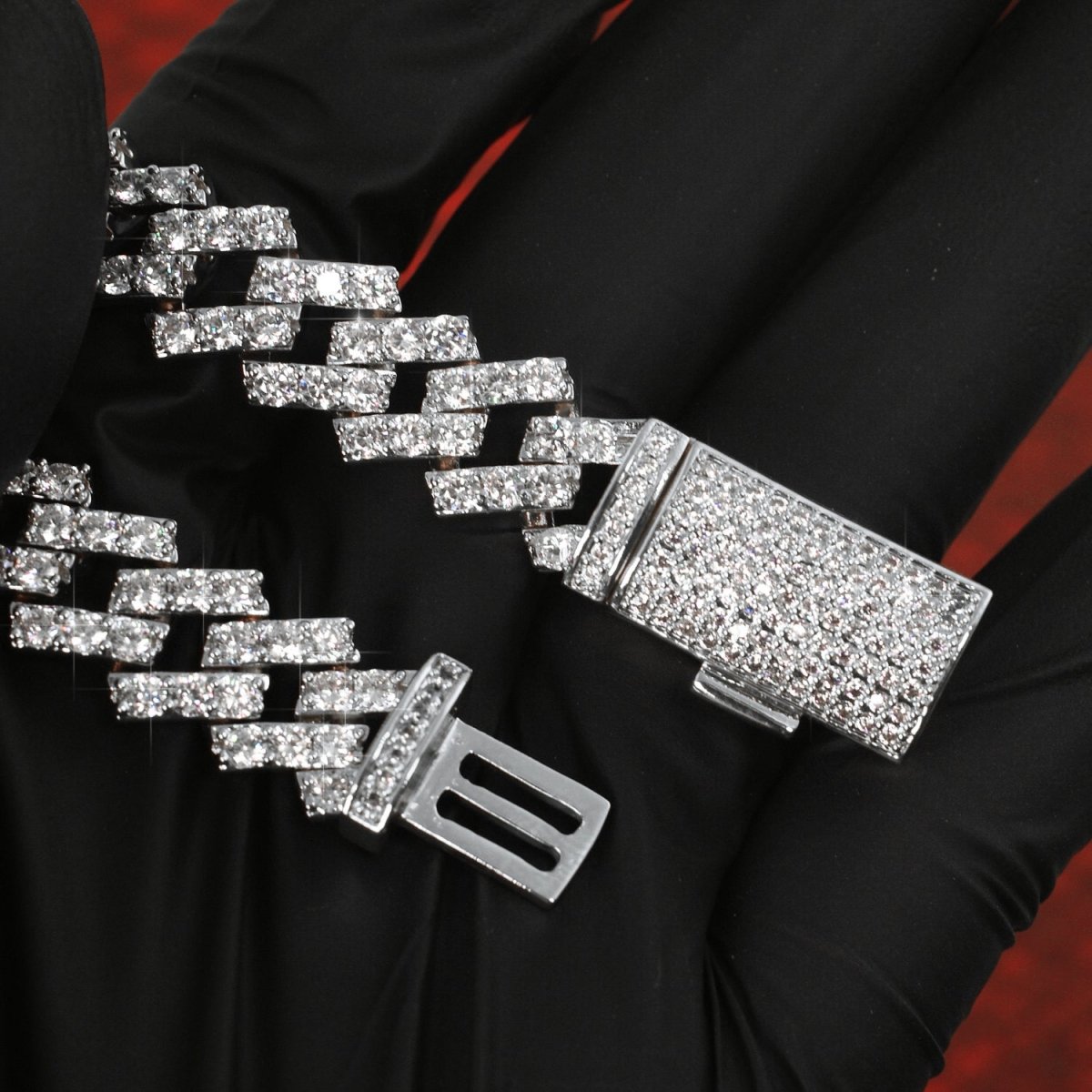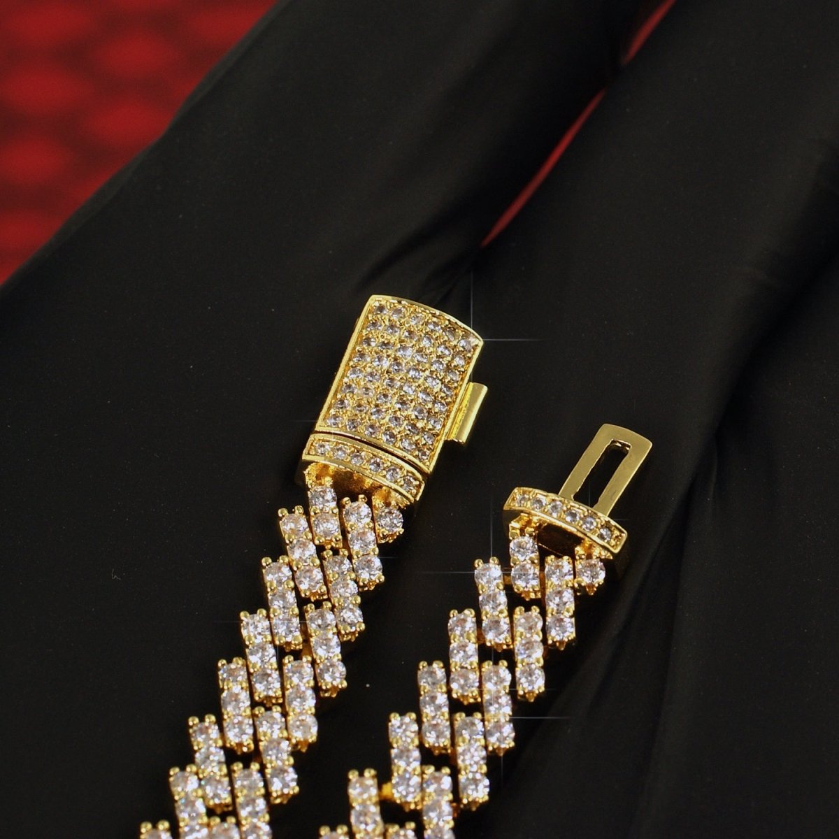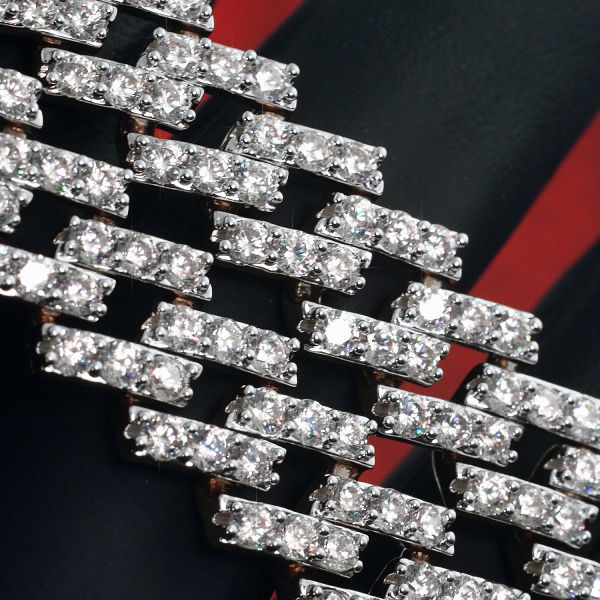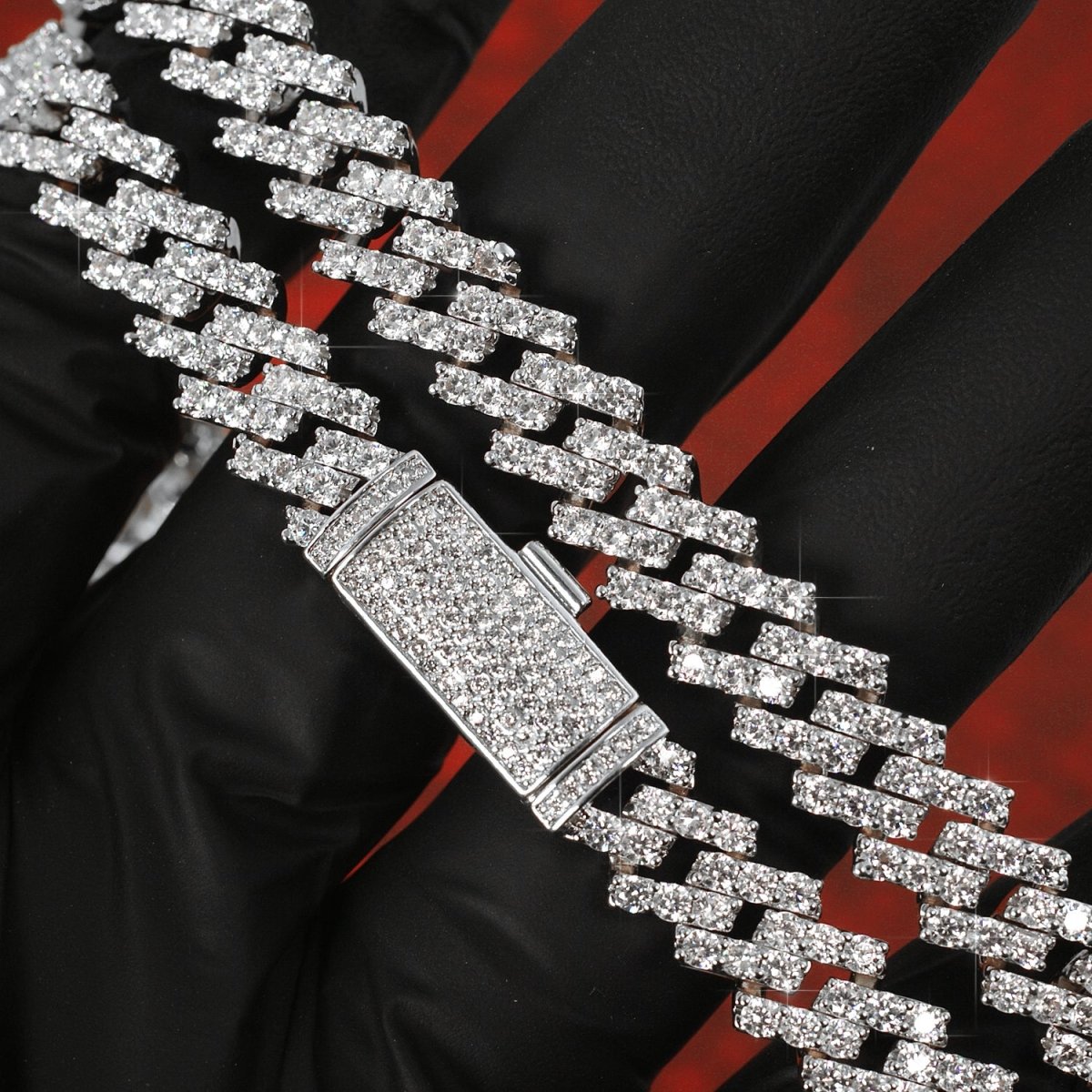 These chains are made with the highest grade simulated diamonds with the same cut and polish techniques used on natural diamonds. The chain is hand made by our master jewelers just like a solid gold chain. The large box clasp is easy to use and secure. This chain can be ordered in solid gold starting at $6000 and up. Please contact us for inquiries.