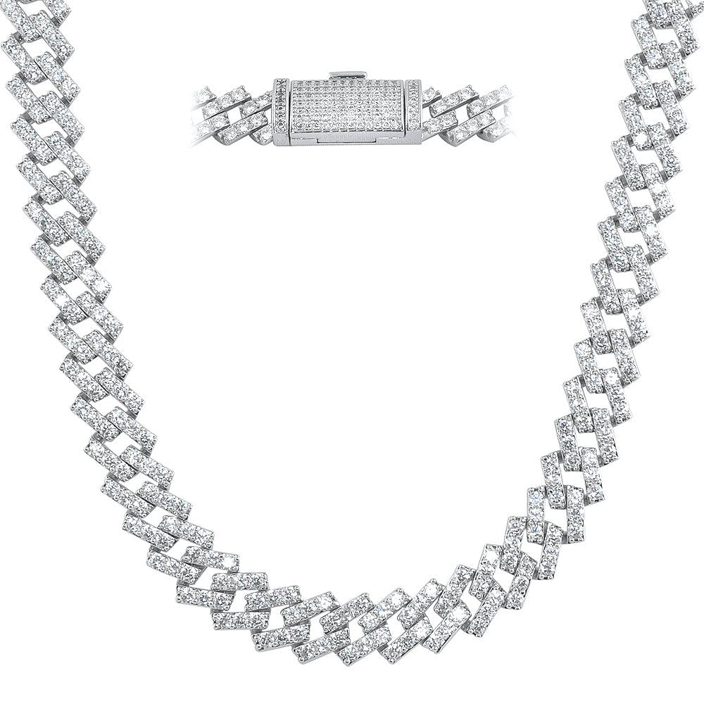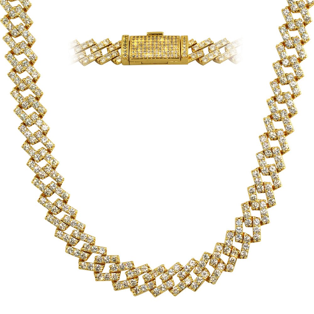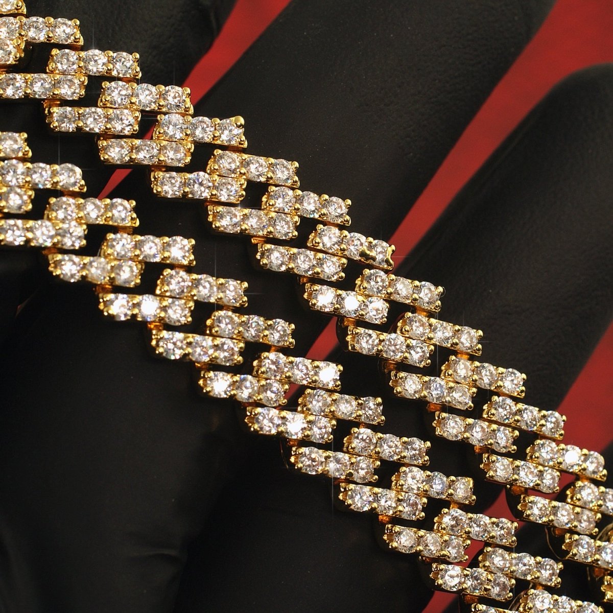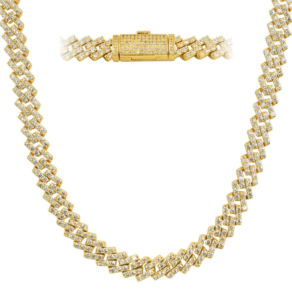 These chains are made with the highest grade simulated diamonds with the same cut and polish techniques used on natural diamonds. The chain is hand made by our master jewelers just like a solid gold chain. The large box clasp is easy to use and secure. This chain can be ordered in solid gold starting at $6000 and up. Please contact us for inquiries.