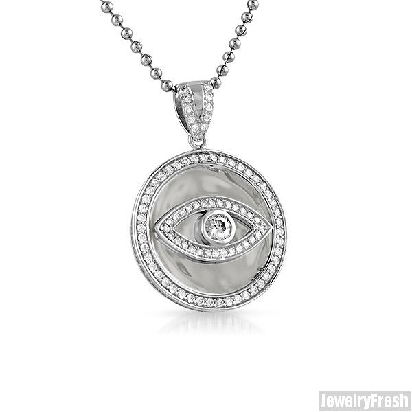 This incredible evil eye pendant is hand made by JF master jewelers. The eye is a bezel set half carat lab diamond. The entire pendant is highly detailed with stones on the bail and even the sides of the pendant This is a perfect small pendant for everyday wear. It is made out of real silver, no color changing. It comes ready to wear with a 2mm stainless steel bead chain in 36 inches. You can cut it down to any length you want. Order yours today!