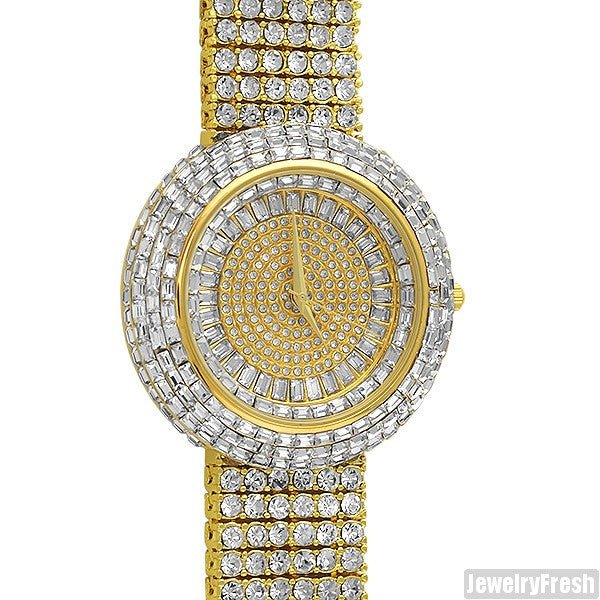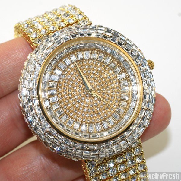 Introducing the legendary Ice Orbit watch. This watch is fully flooded with genuine Czech crystals (not cheap rhinestones) in baguette and round cut. The entire inner and outer dial is covered with stones, as well as a 4 row baguette bezel. This watch is incredible in person and the shine is beyond anything else out there. It is made out of alloy metal with a reliable Japanese quartz movement. It is custom made, not found in stores. It comes in 3 fixed sizes and the band cannot be adjusted. Please choose the size that you need.