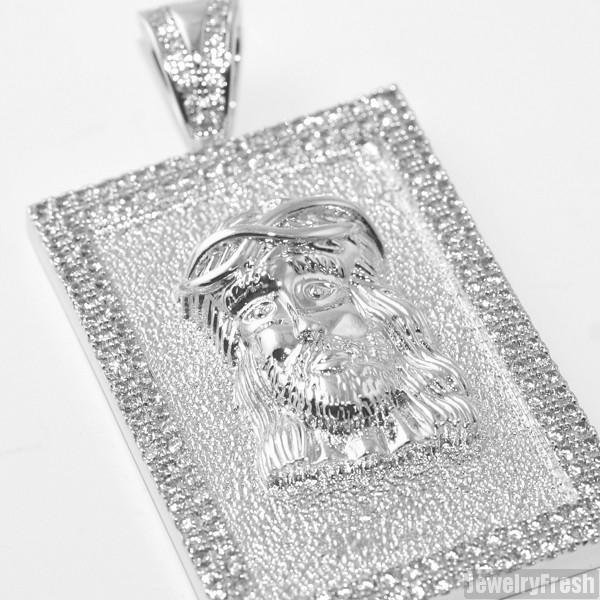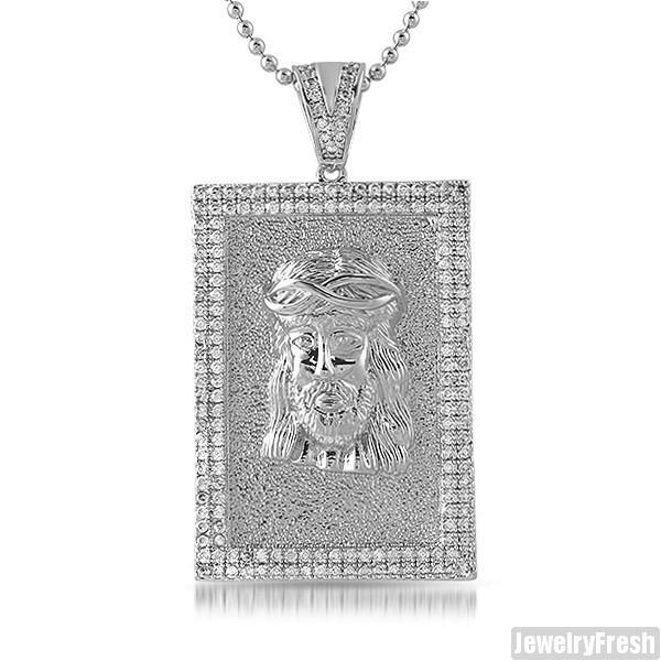 This incredible rectangular medallion is 3D raised in the center with a nugget textured background. The border is raised and features 2 rows of VVS flawless lab created simulated diamonds. Each are prong set by hand. This item comes with a free 36 inch bead chain. You can cut it down to any length once you receive it.