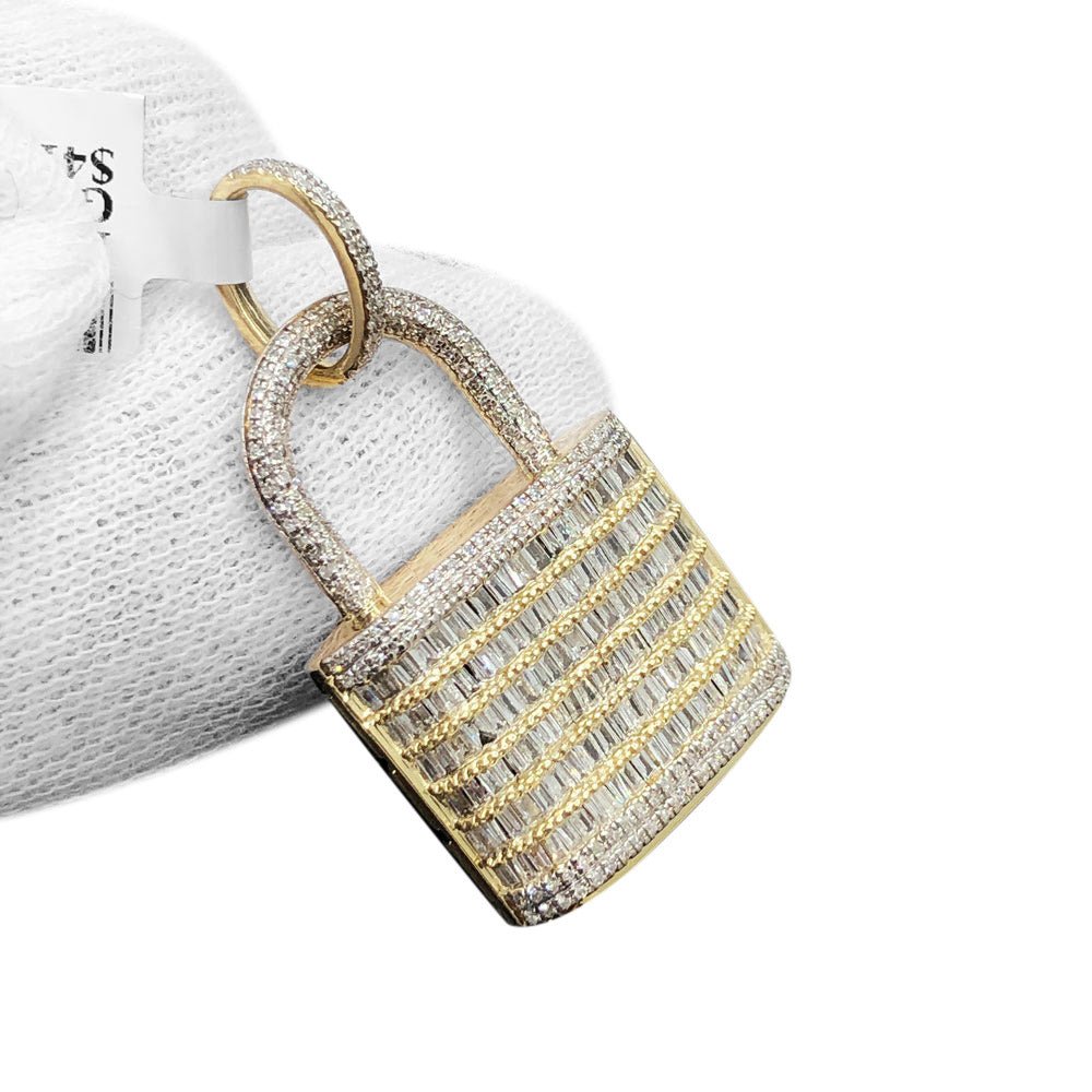 This highly detailed lock pendant is fully iced out with baguette accents. Shine right with real diamonds set on gold. Makes an excellent gift for someone or treat yourself! Order yours today.