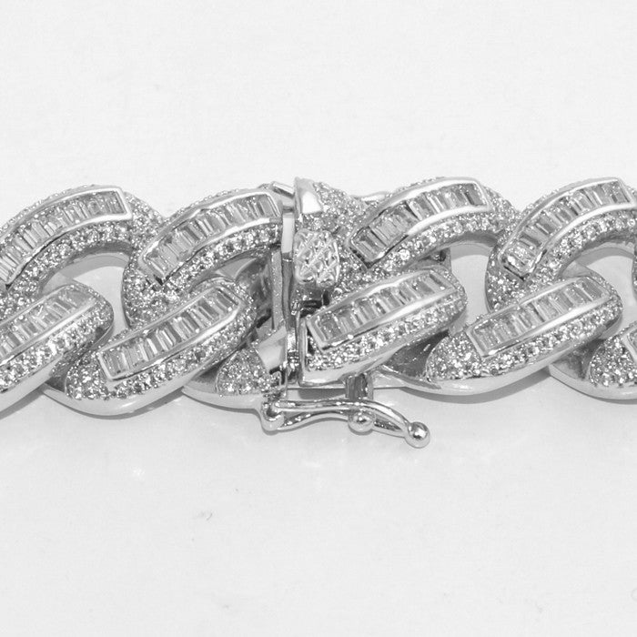 This is the most impressive iced cuban bracelet we have ever released. This stunning chain features 1400 baguette and round cut lab diamonds precision set onto a thick, solid cuban bracelet. Only master jewelers are capable of this type of channel setting with over 5 man hours per bracelet. This item is made out of solid brass with rhodium plating. Comes with a hidden clasp with double security locks. Item has a solid back side, can be worn reversed as well. Order yours today. This is a limited edition item.