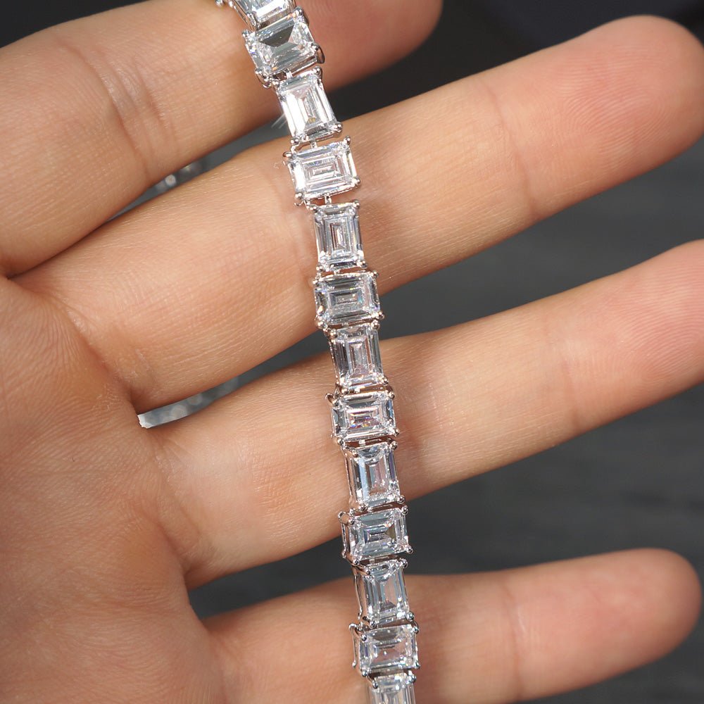 It hit different! Get stares and compliments all day with this JF exclusive unique exotic cut tennis bracelet. Every single link is a full 1 carat emerald cut simulated diamond, with the exact same cut and polish as natural diamonds. Each prong set stone is VVS+ clarity, giving you the pure water flawless look. Order yours today and rock it in just a few days!