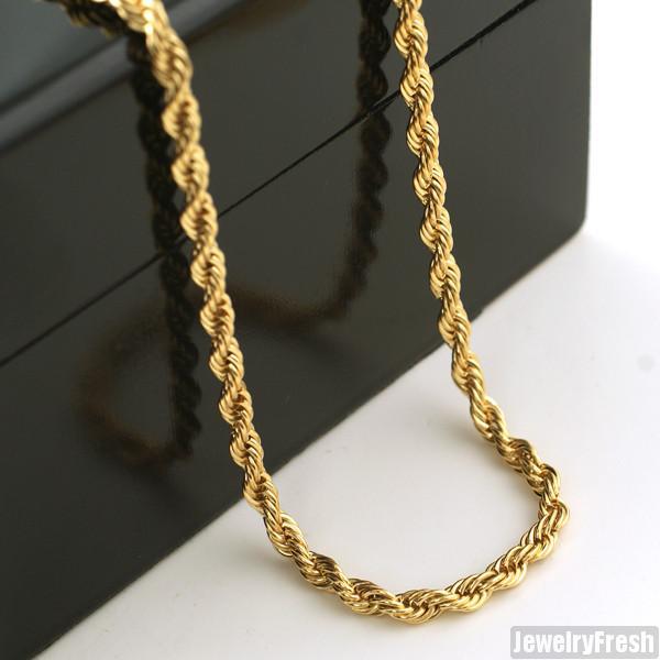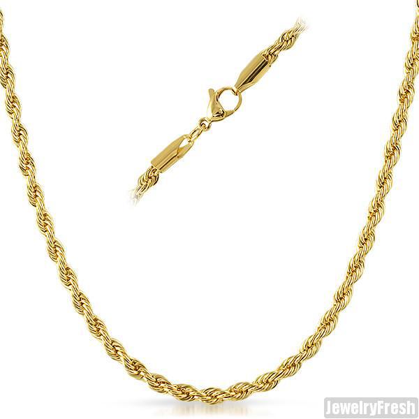 This classic French rope chain is a perfect 4mm size. It works great with smaller pendants or a standalone chain. Matching bracelet is available. It is made out of solid 316L stainless steel and polished to perfection by our expert jewelry production team. 14K IP plating is the best type of plating available. It looks and feels like real gold.