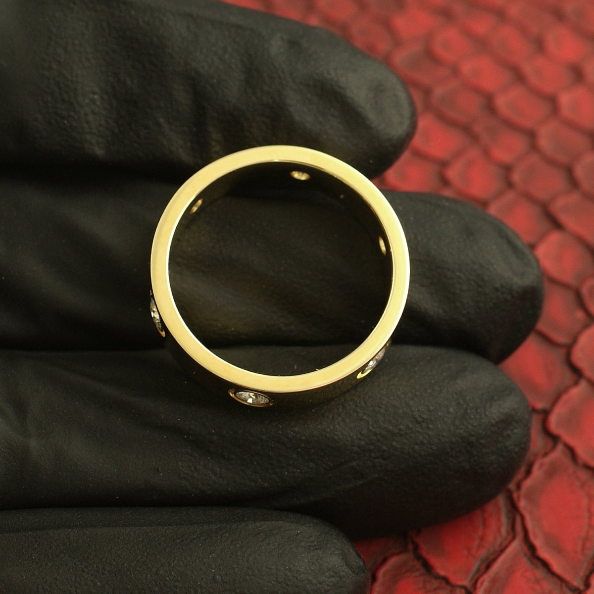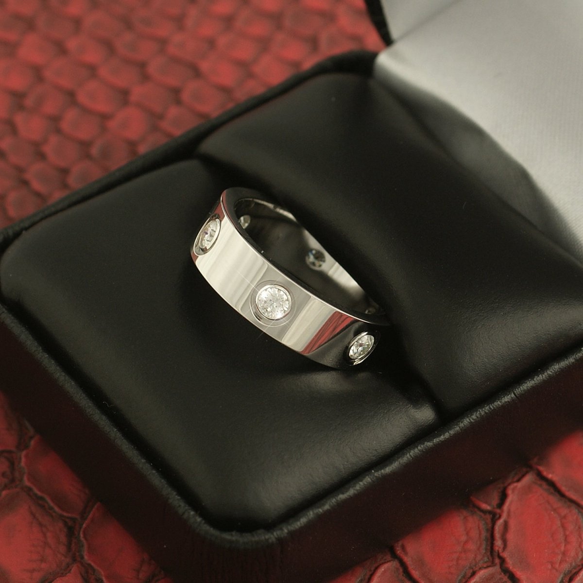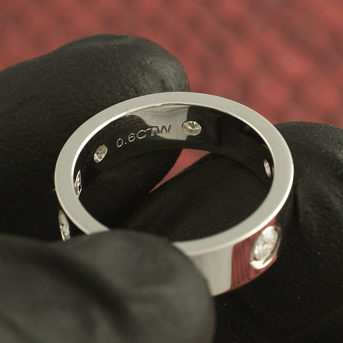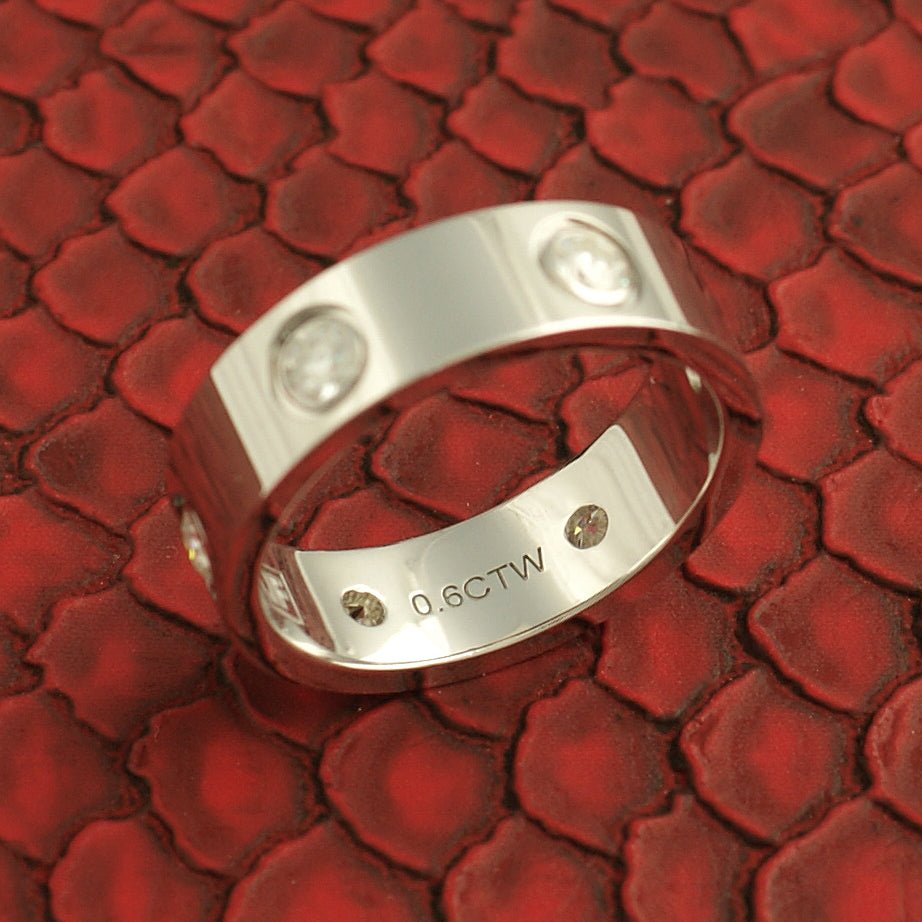 This luxurious designer style ring is perfect for guys or girls. It is polished to a mirror-like shine and features 6 bezel-set moissanite stones set flawlessly by JF master jewelers to provide just enough shine. Order yours today!