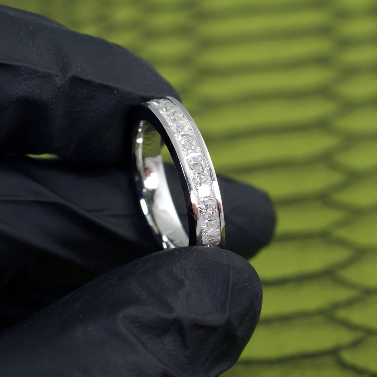 This stunning moissanite eternity ring looks impressive and is built to last a lifetime. Channel set princes cut stones will shine from a distance. Step into the luxury life with this icy masterpiece. Order yours today!