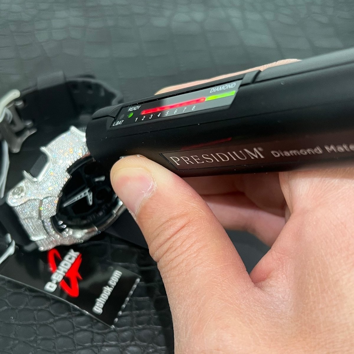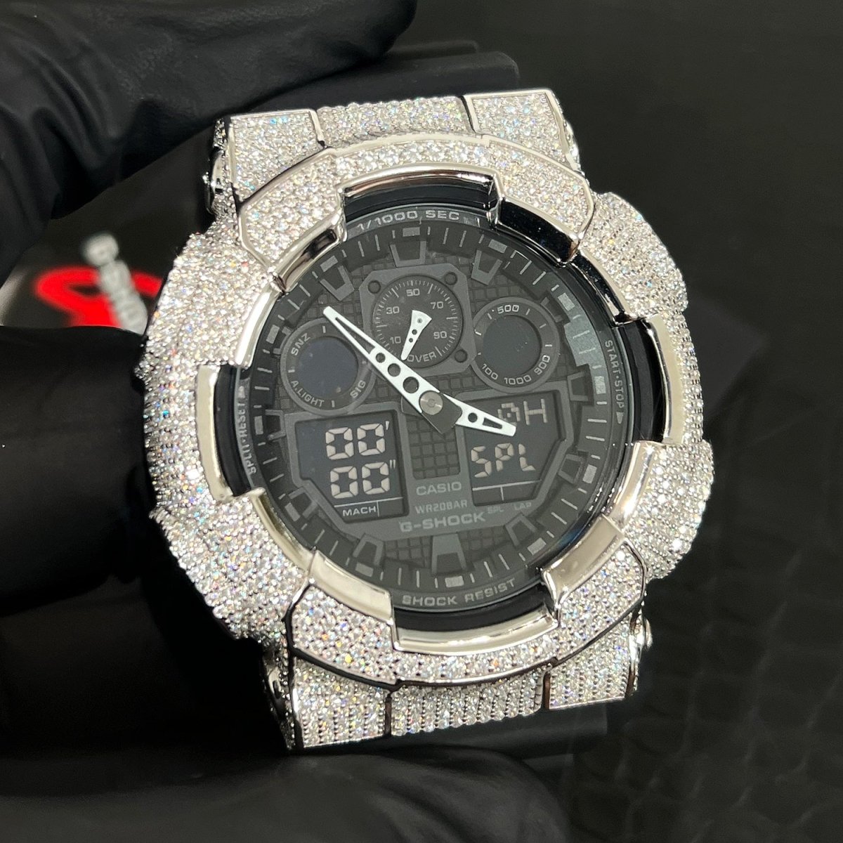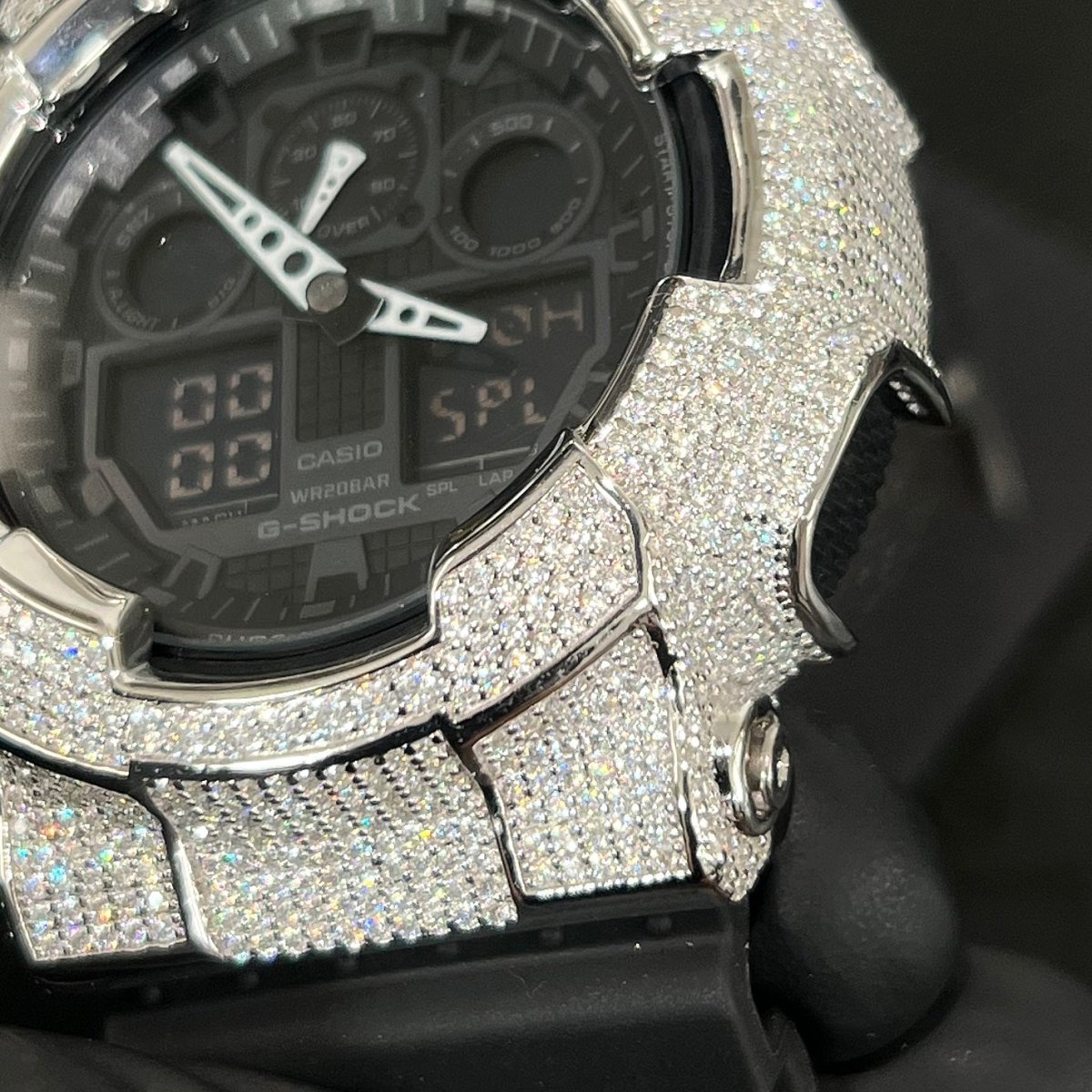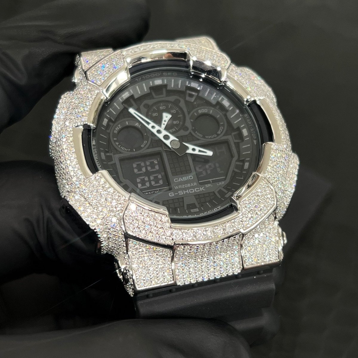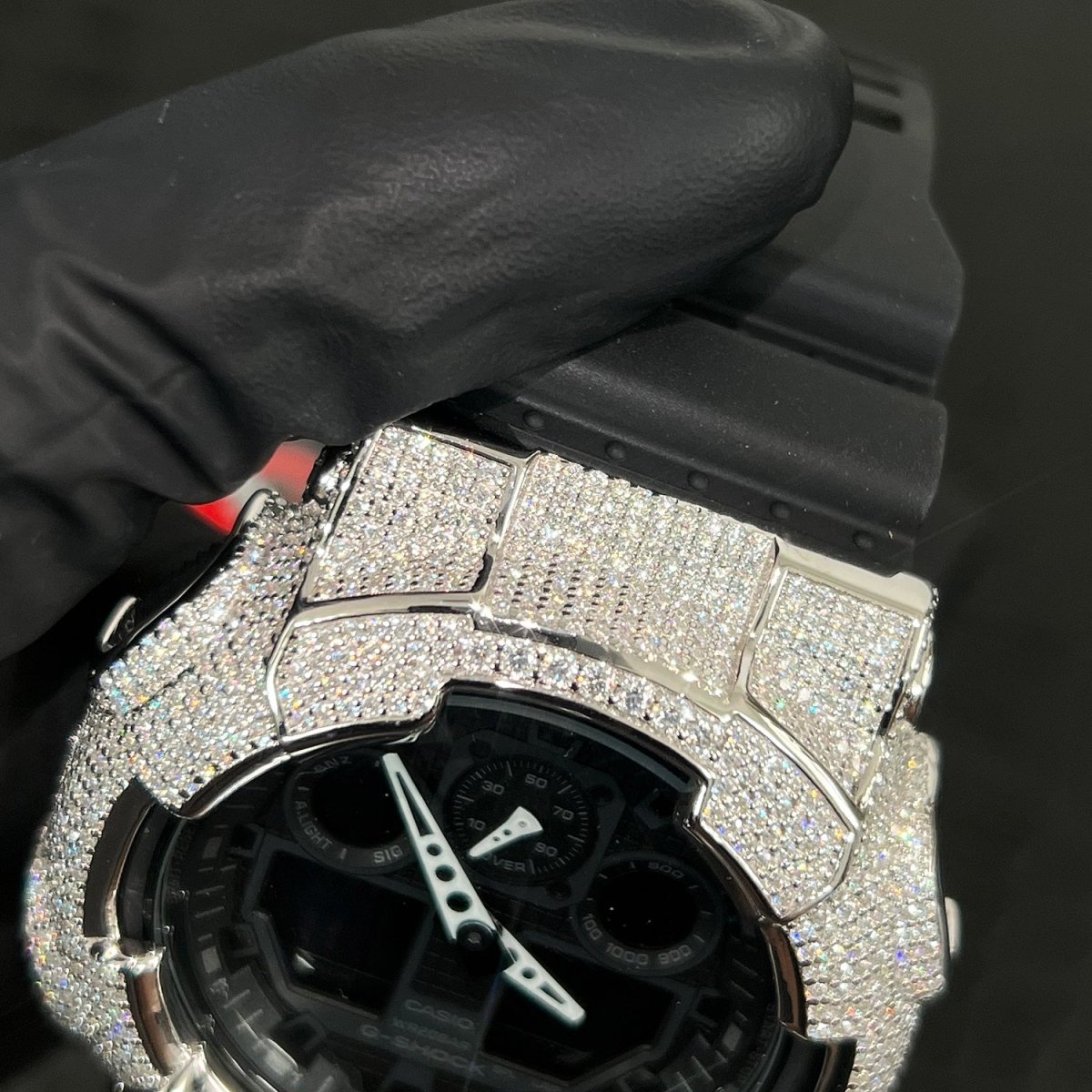 This incredible custom G shock outshines everything! This authentic GA-100 is fitted with our exclusive top quality 925 silver bezel hand set with 6.58 carats of sizzling VVS1 clarity Moissanite stones. This watch will light your wrist up. Order yours before we sell out!