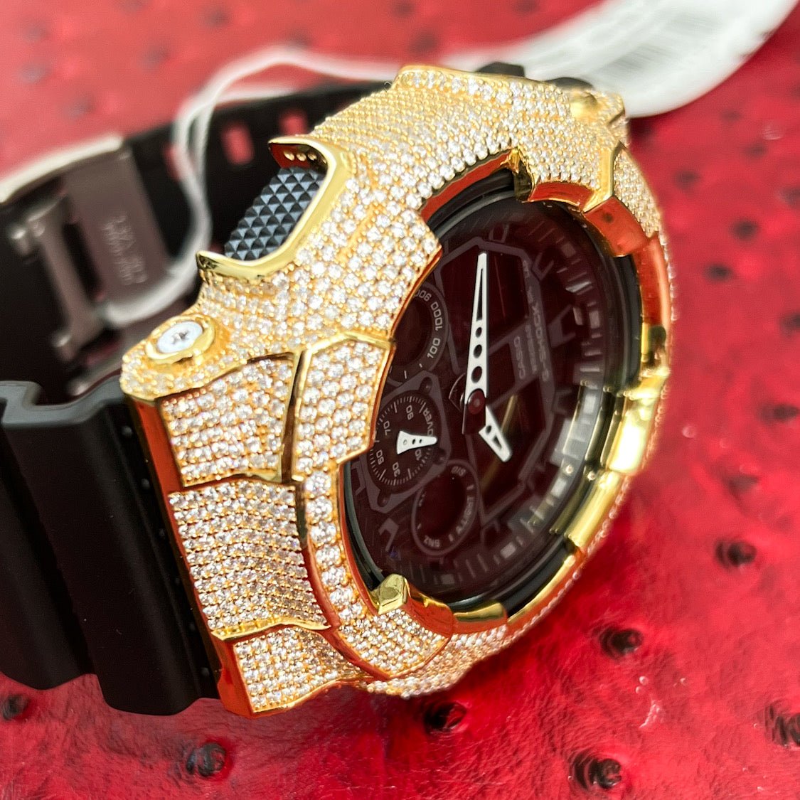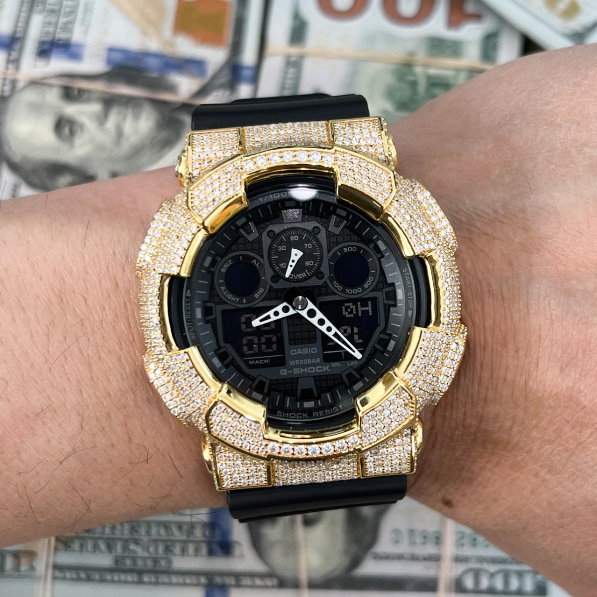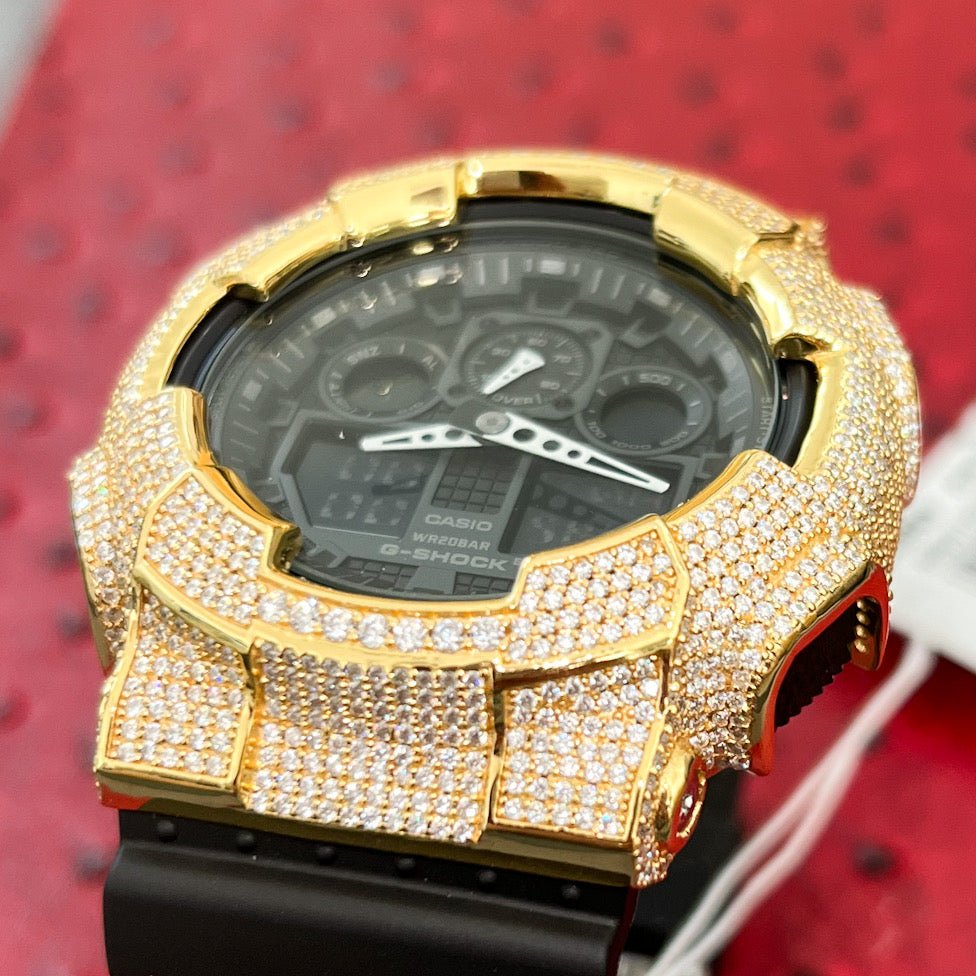 This incredible custom G shock outshines everything! This authentic GA-100 is fitted with our exclusive top quality 925 silver bezel hand set with 6.58 carats of sizzling VVS1 clarity Moissanite stones. This watch will light your wrist up. Order yours before we sell out!