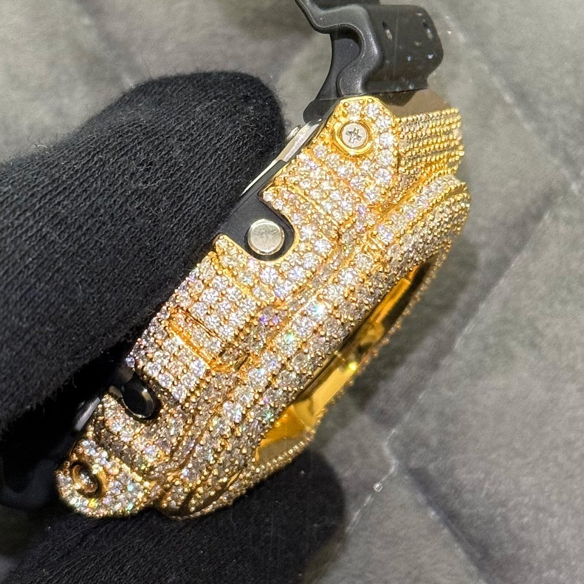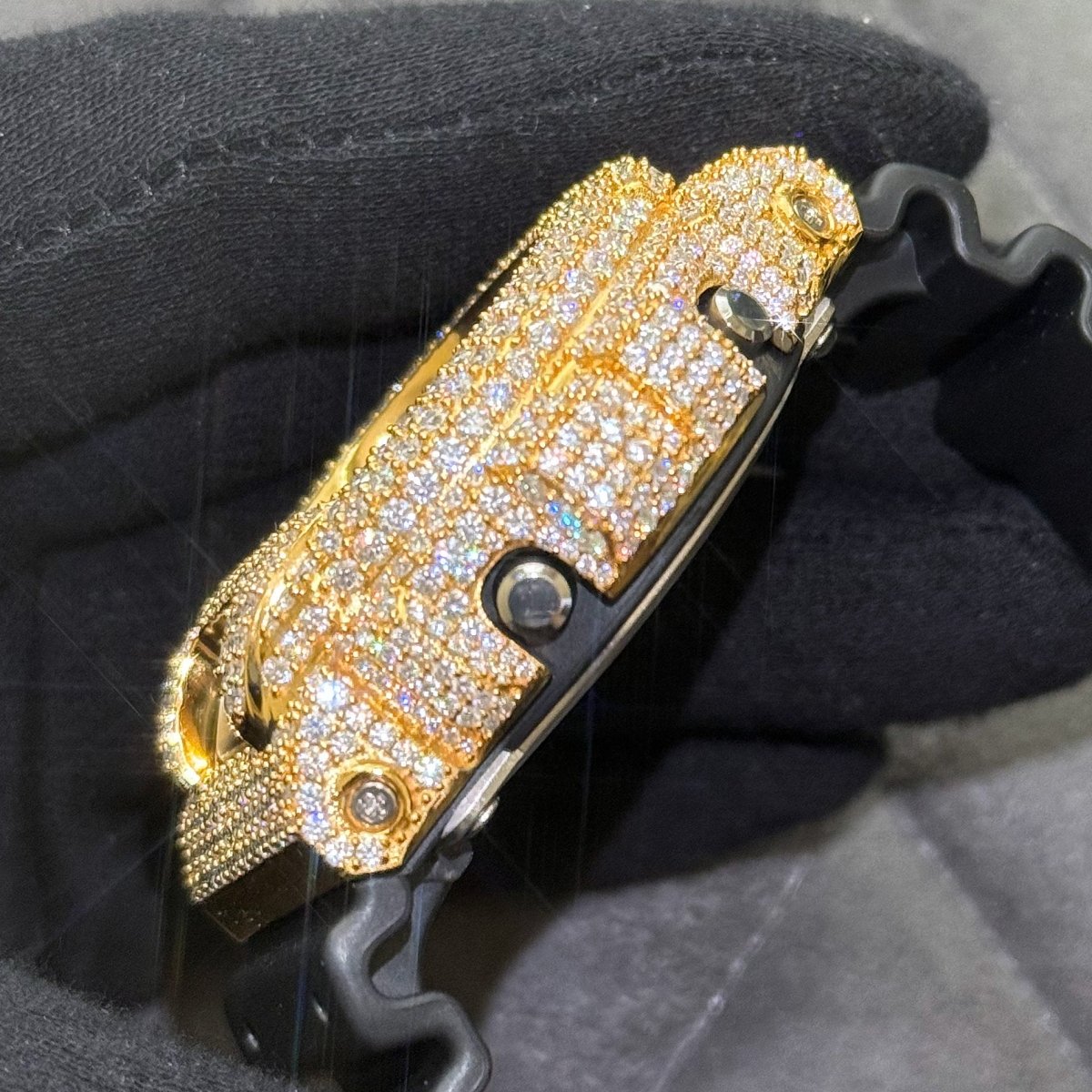 The most iconic street wear watch has been custom fitted with our top quality crushed out moissanite case. Get ready to shut the room down when you walk in. This watch will get attention from haters and admirers alike.