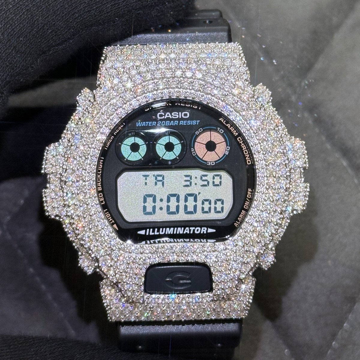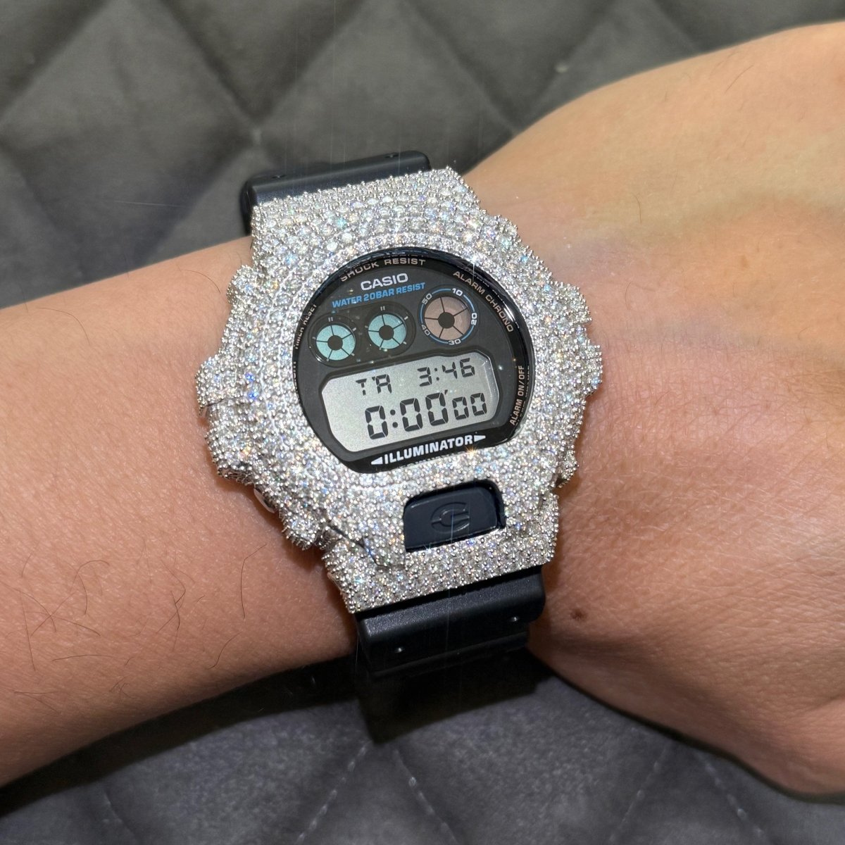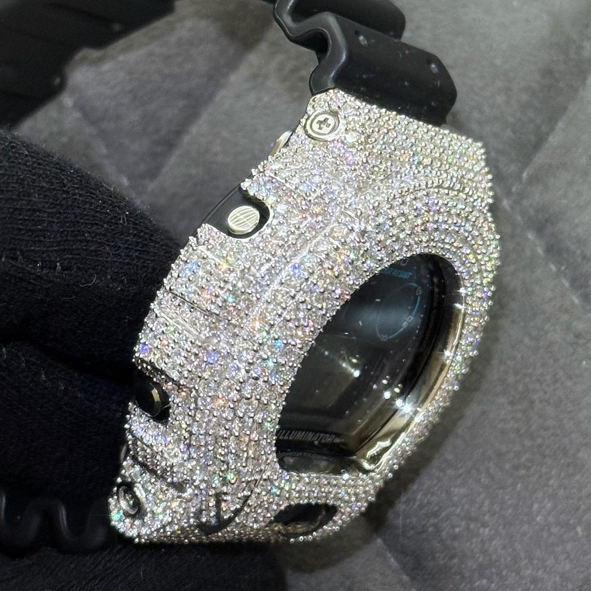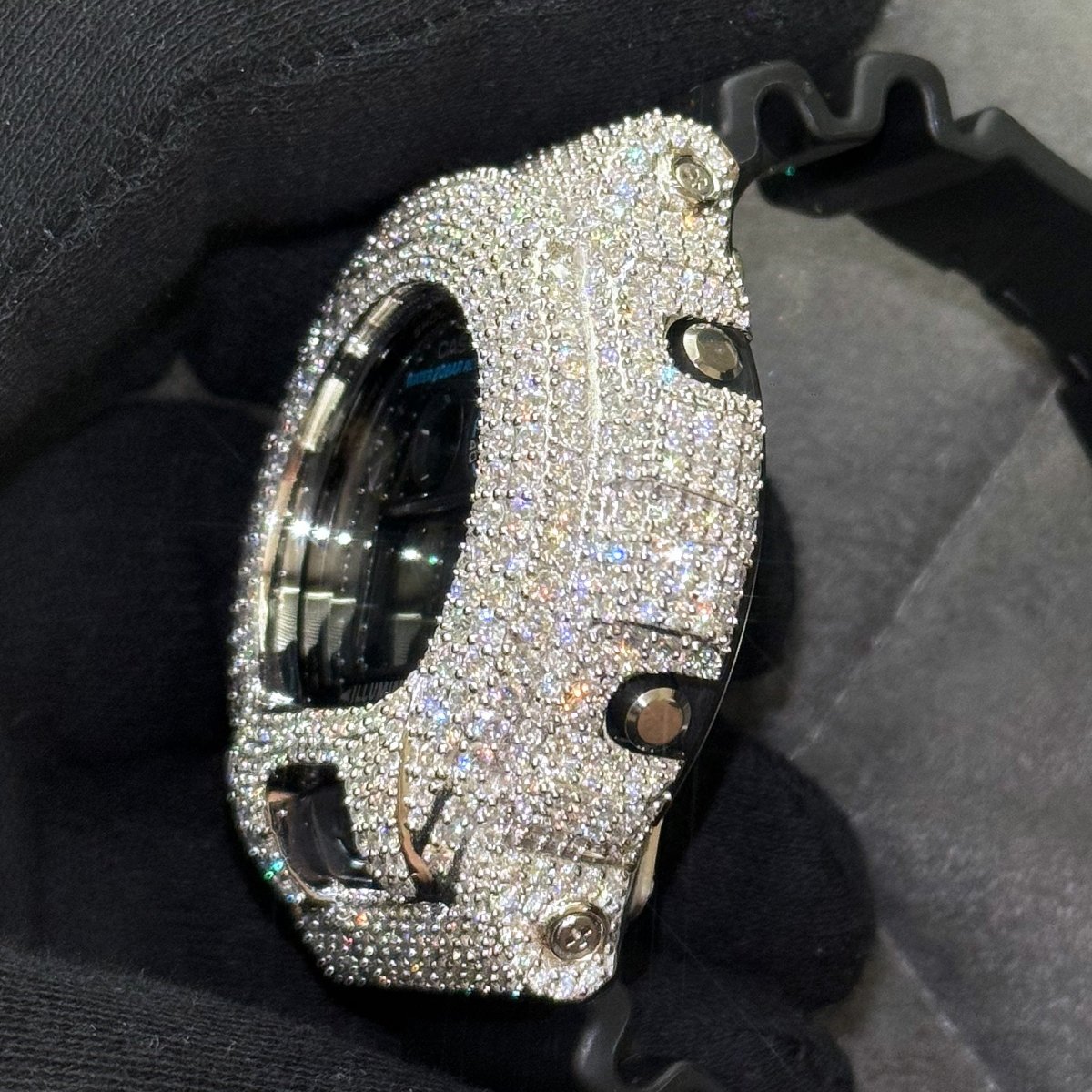 The most iconic street wear watch has been custom fitted with our top quality crushed out moissanite case. Get ready to shut the room down when you walk in. This watch will get attention from haters and admirers alike.