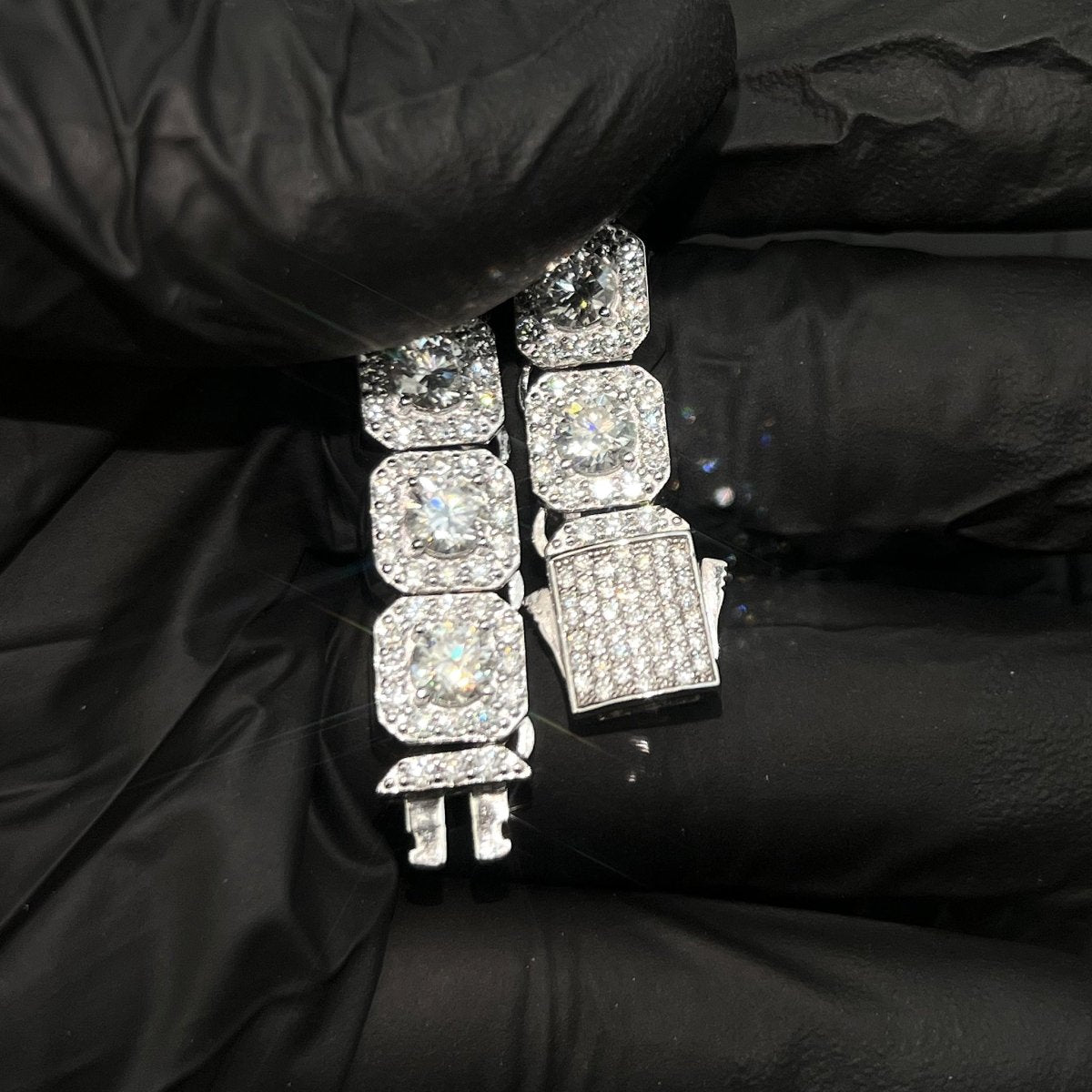 Boss up with this heavy crushed out bracelet. It is hand set with over 30 carats of VVS1 clarity moissanite. Order yours today!