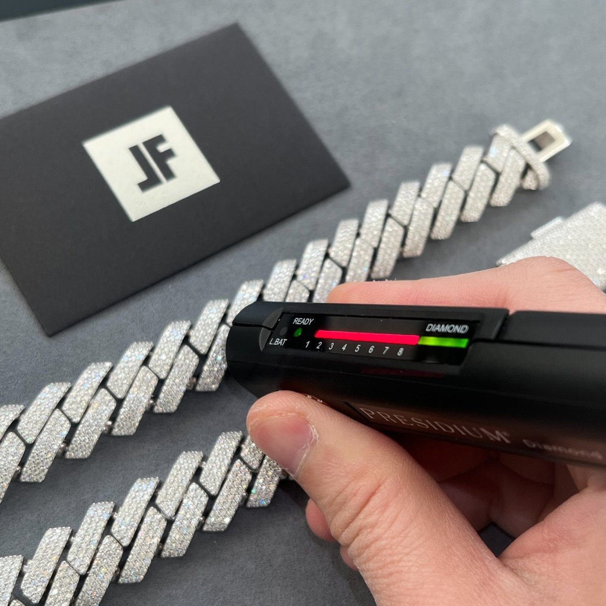 Moissanite shines harder than any other gemstone in existence with and is known to pass commonly used diamond testers. They have a 9.25 out of 10 mohs hardness rating, making them nearly as hard as diamonds so they don't pick up scratches and lose shine like most fake diamonds with a 3-4 hardness level. Get the same look as a high end white gold diamond chain without spending $40,000+. This top quality real silver chain will last a lifetime. Order yours today!