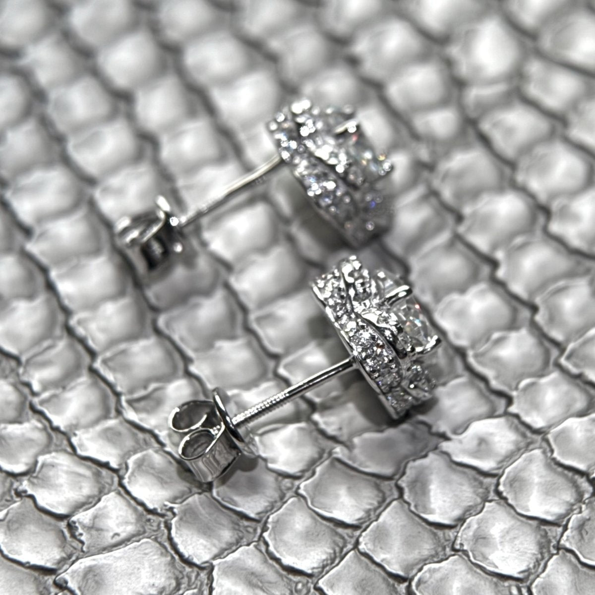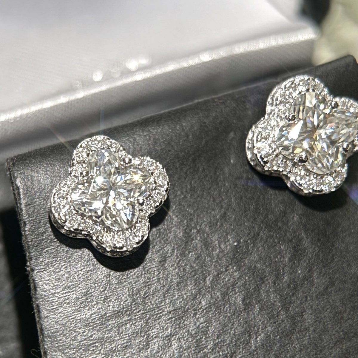 Get that designer look with custom cut clover moissanite stones! The shape of the stone itself is a clover. Stand out with this unique pair of GRA certified VVS Moissanite earrings.