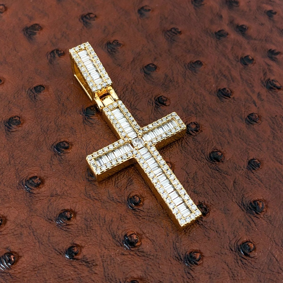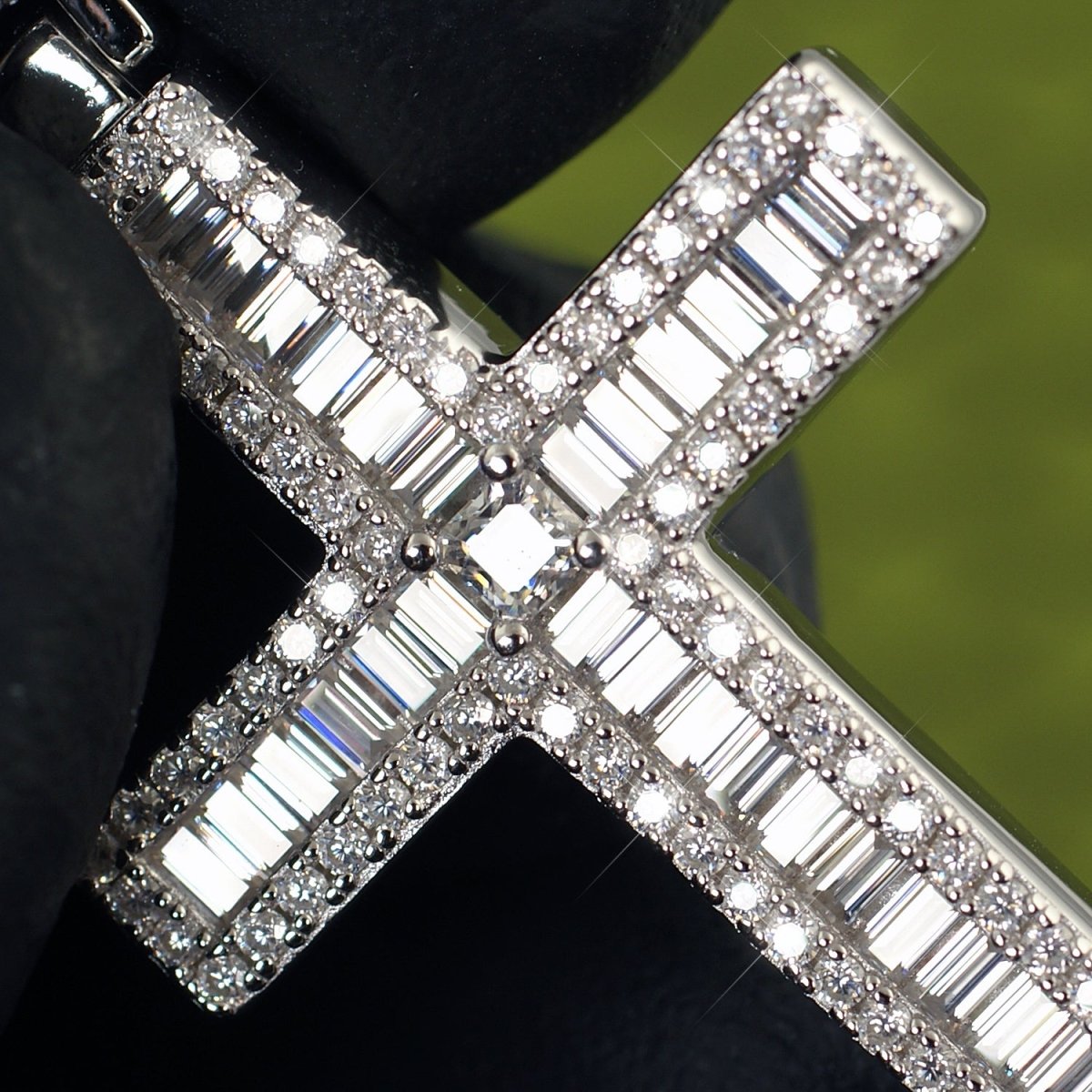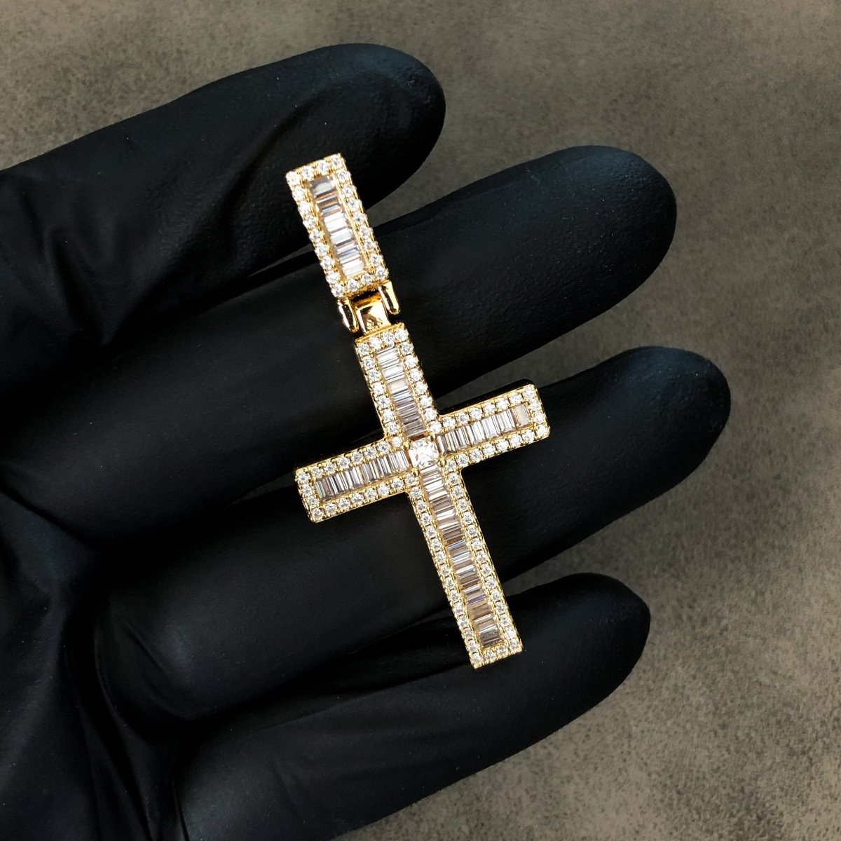 Welcome to the next level of luxury. This breath-taking cross hits different! It is meticulously hand set with fancy cut baguette stones and an asscher cut center stone for the ultimate finishing touch.