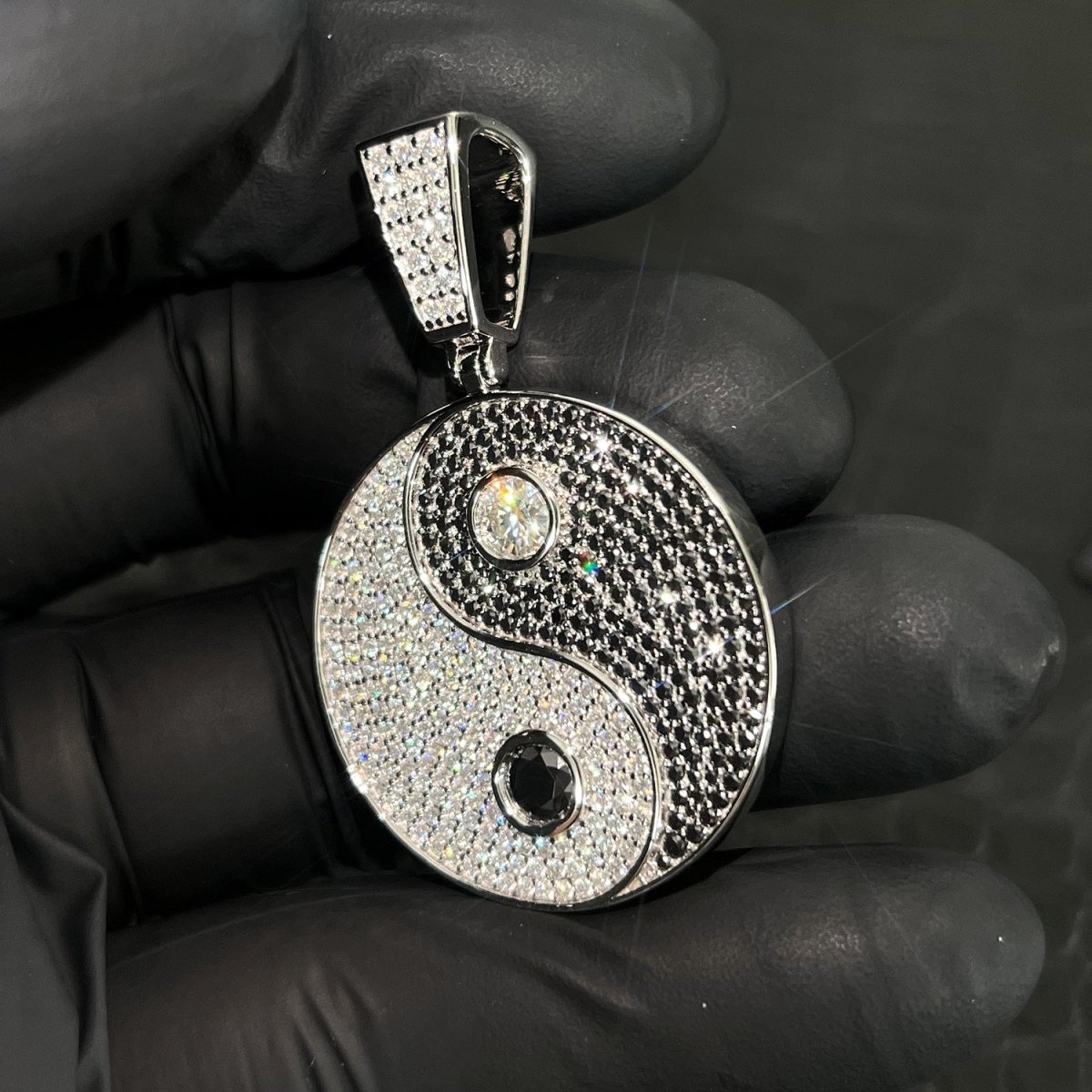 The Yin Yang symbol represents balance and harmony in one's life for thousands of years. We take that work hard play hard mentally to the next level with this stunning piece. Two large black and white Moissanite stones are surrounded by a sea of glistening ice. The perfect sized piece that's noticeable without being over the top. Order yours today!