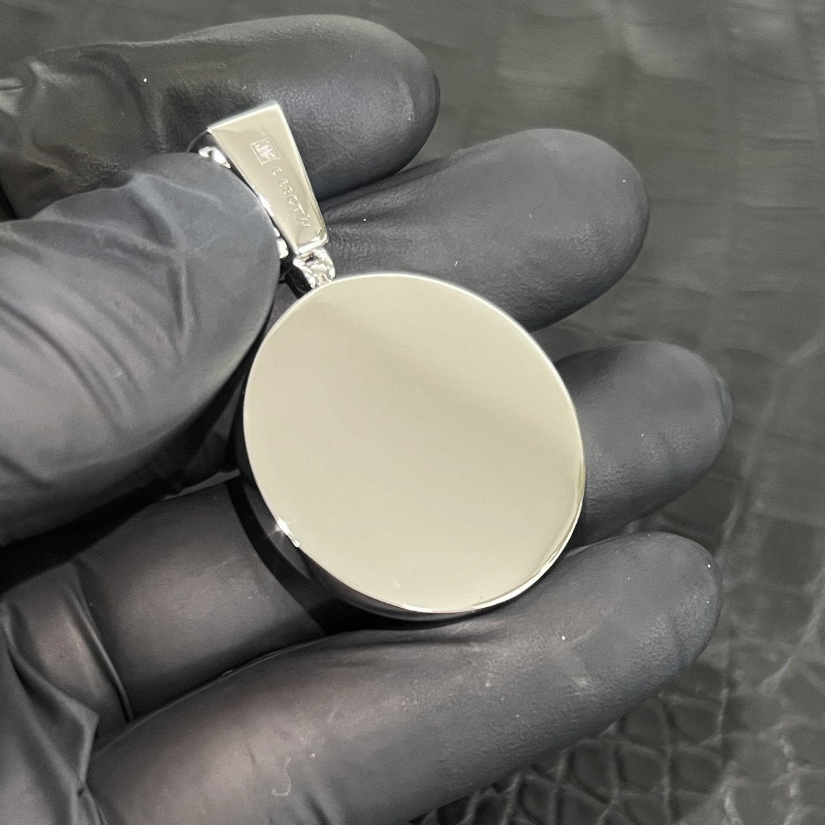 This top level hand crafted pendant is made solid 925 sterling silver. This masterpiece is covered with the highest grade Moissanite. Moissanite is proven to shine harder than CZ stones and known to pass commonly used diamond testers. Moissanite is made out of carbon and silicon while diamonds are fully carbon. They have a hardness rating of 9.25 out of 10 (diamonds are 10, CZ is 3-4). This means these stones will never lose shine or get dull like cheap fake stones. Get the exact look of a $8,000 high end piece for less!