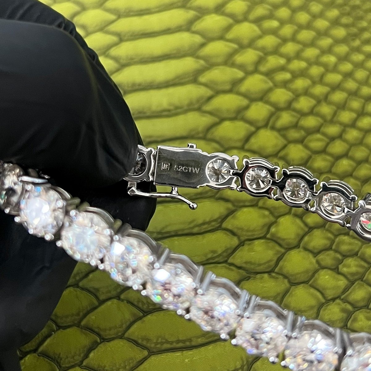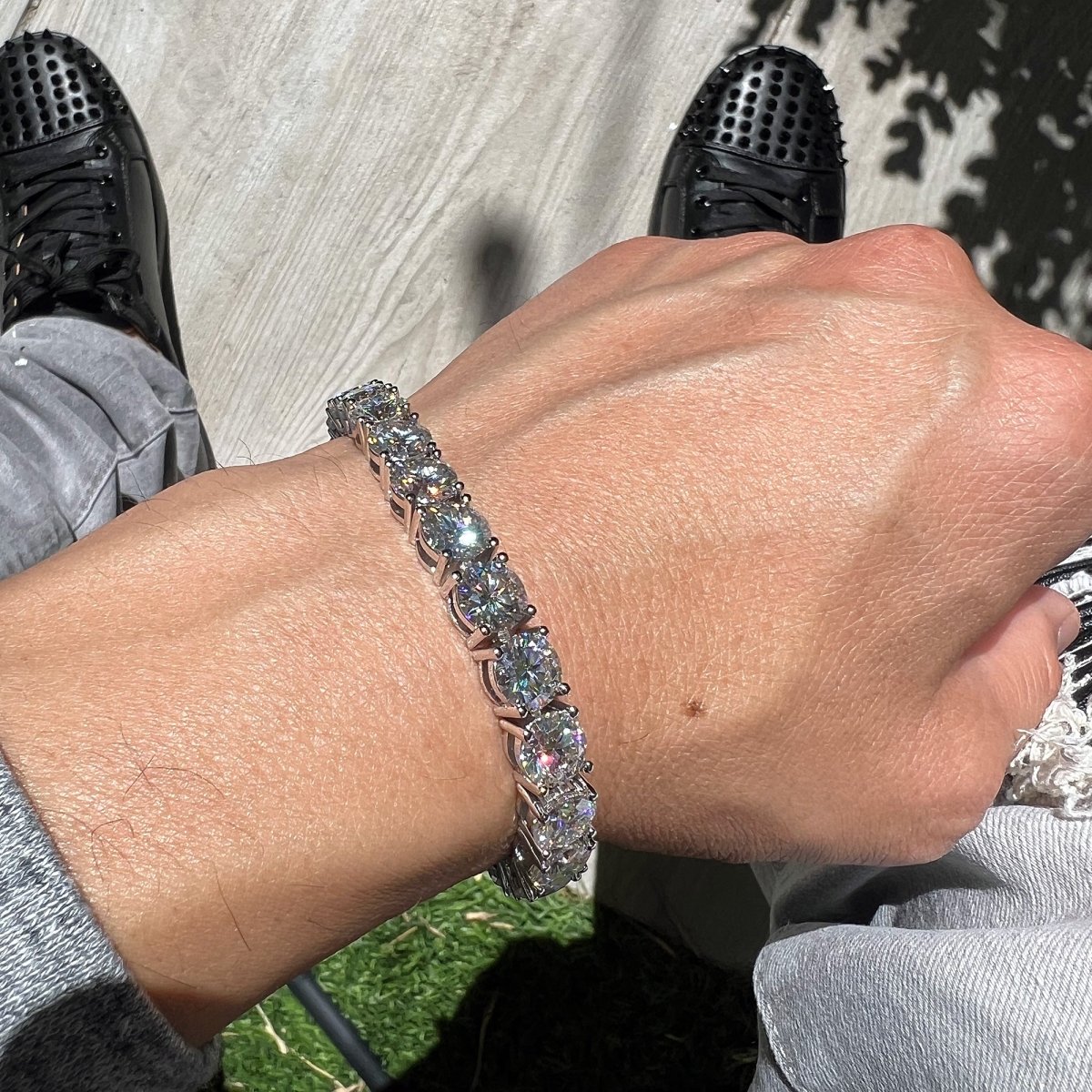 Our top quality colorless moissanite hits harder and outshines everything. They have more fire and brilliance than CZ and any other fake diamond. It has a hardness rating of 9.25 out of 10 and tests positive as a diamond on most handheld testers. Real natural diamond tennis bracelets cost anywhere from $40,000 - $50,000+ Get the exact same look with one of these bracelets!