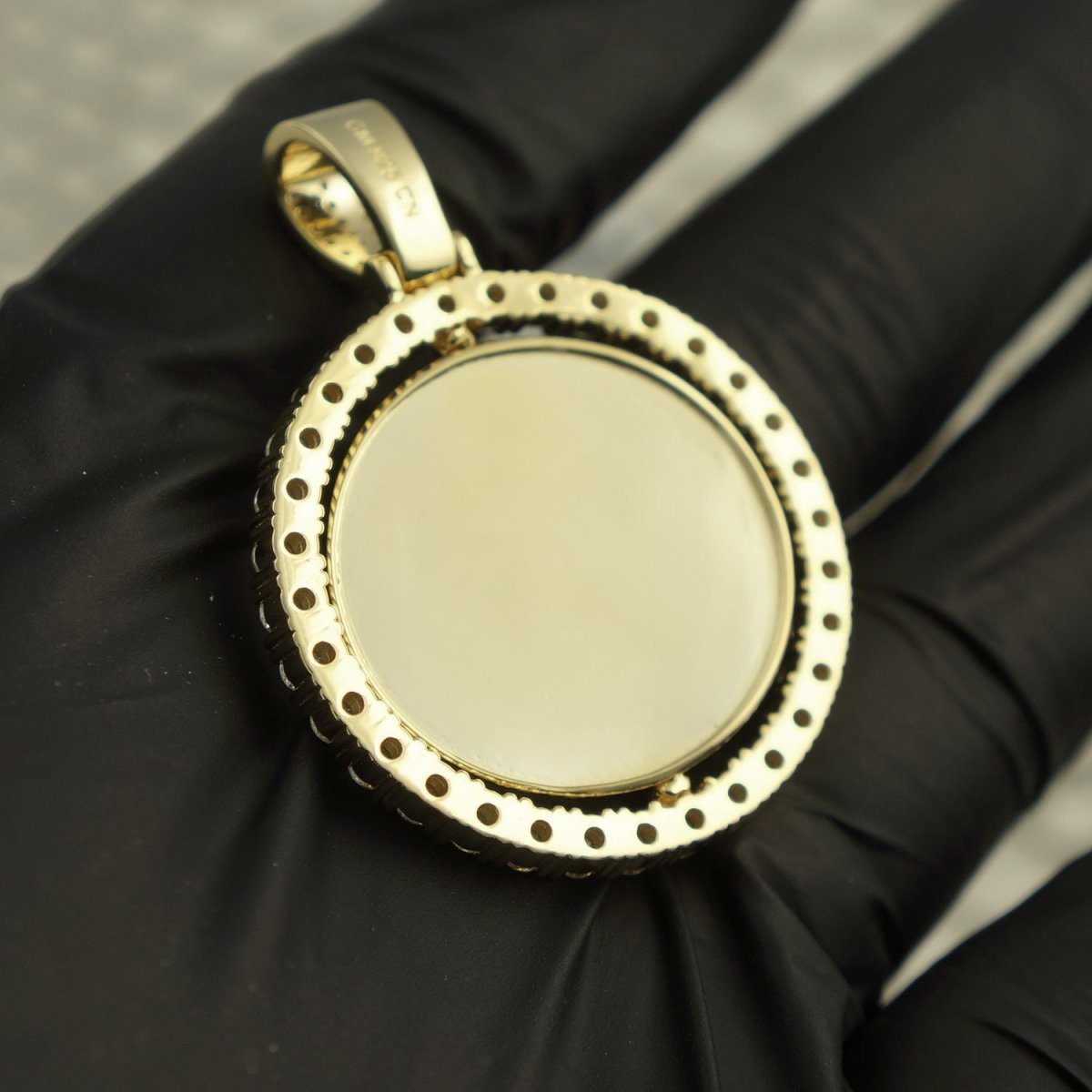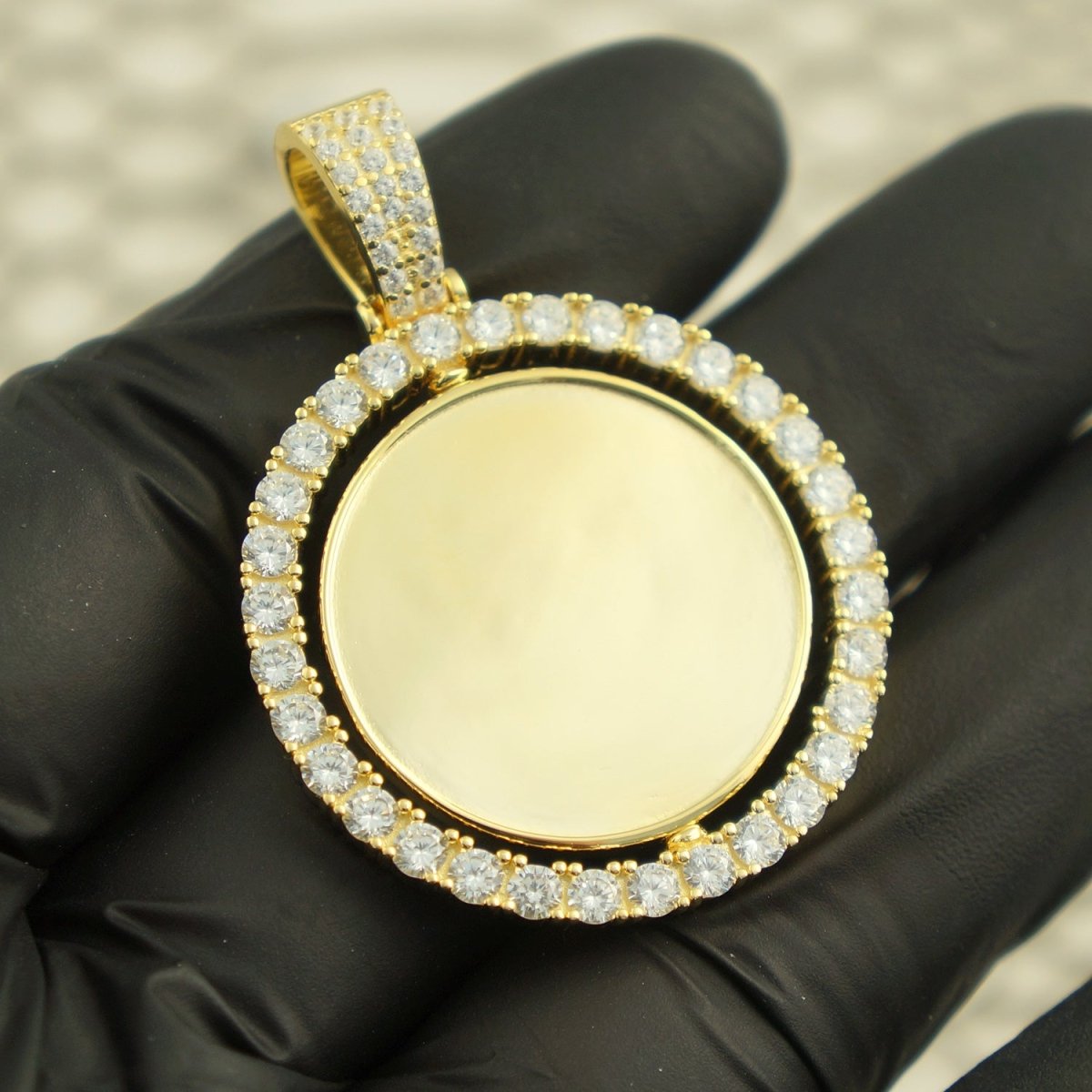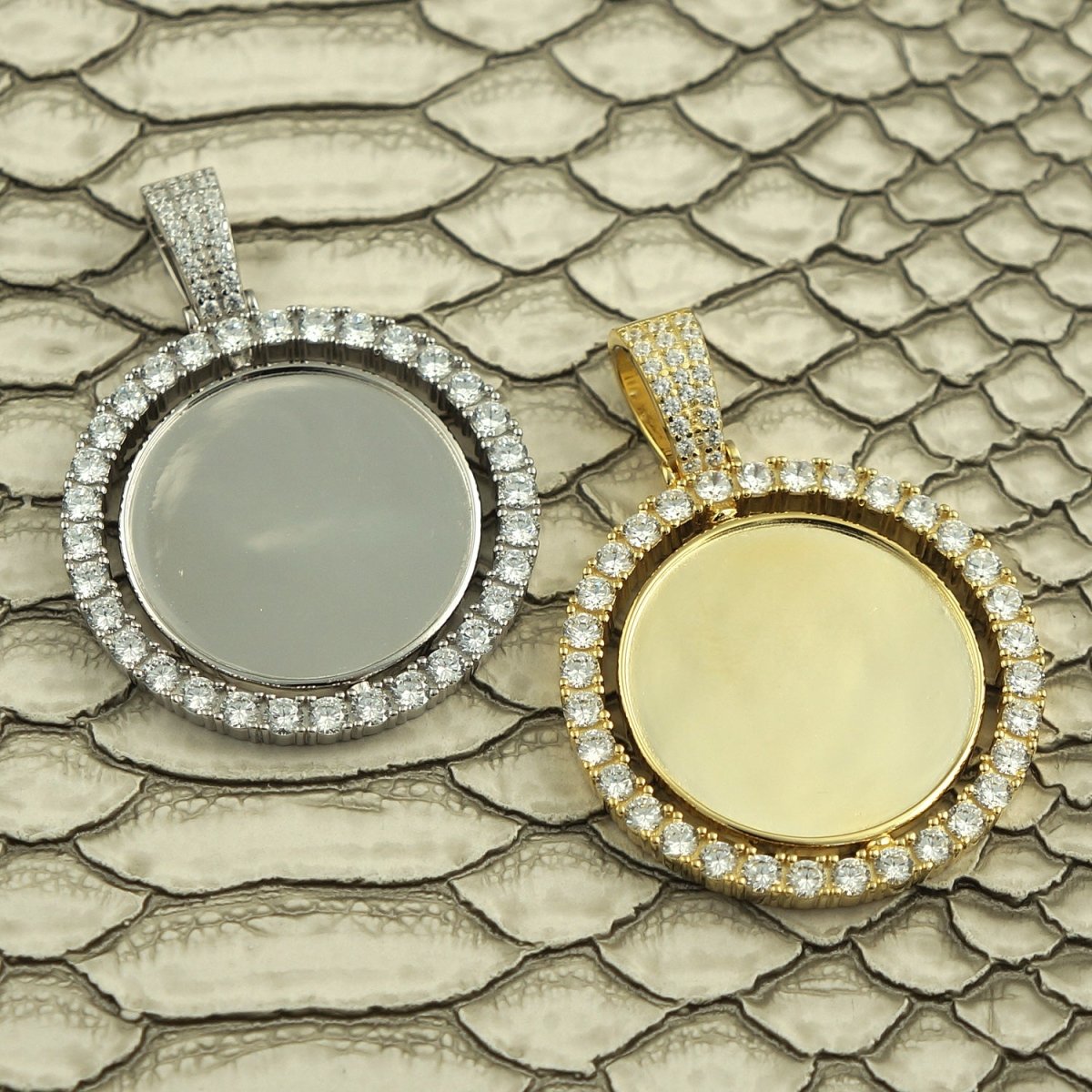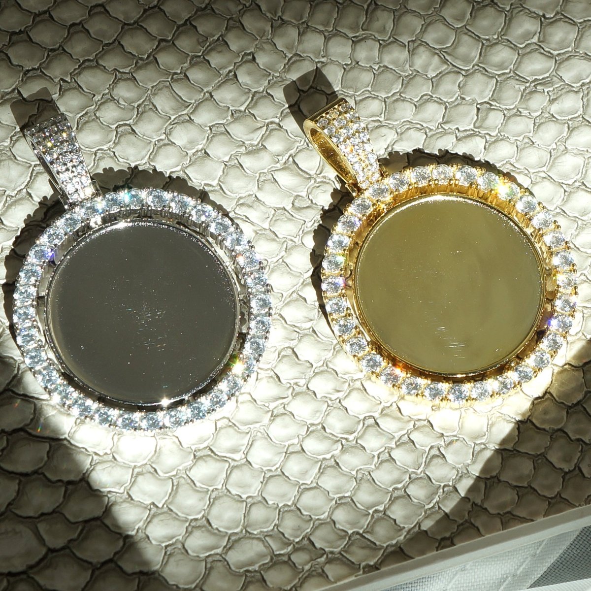 Newest memory pendant in our lineup. This pendant is 2 sided and spins so you can have 2 different pictures. It is made out of 925 silver and prong set with large sized simulated diamonds for the ultimate shine. Get yours today!