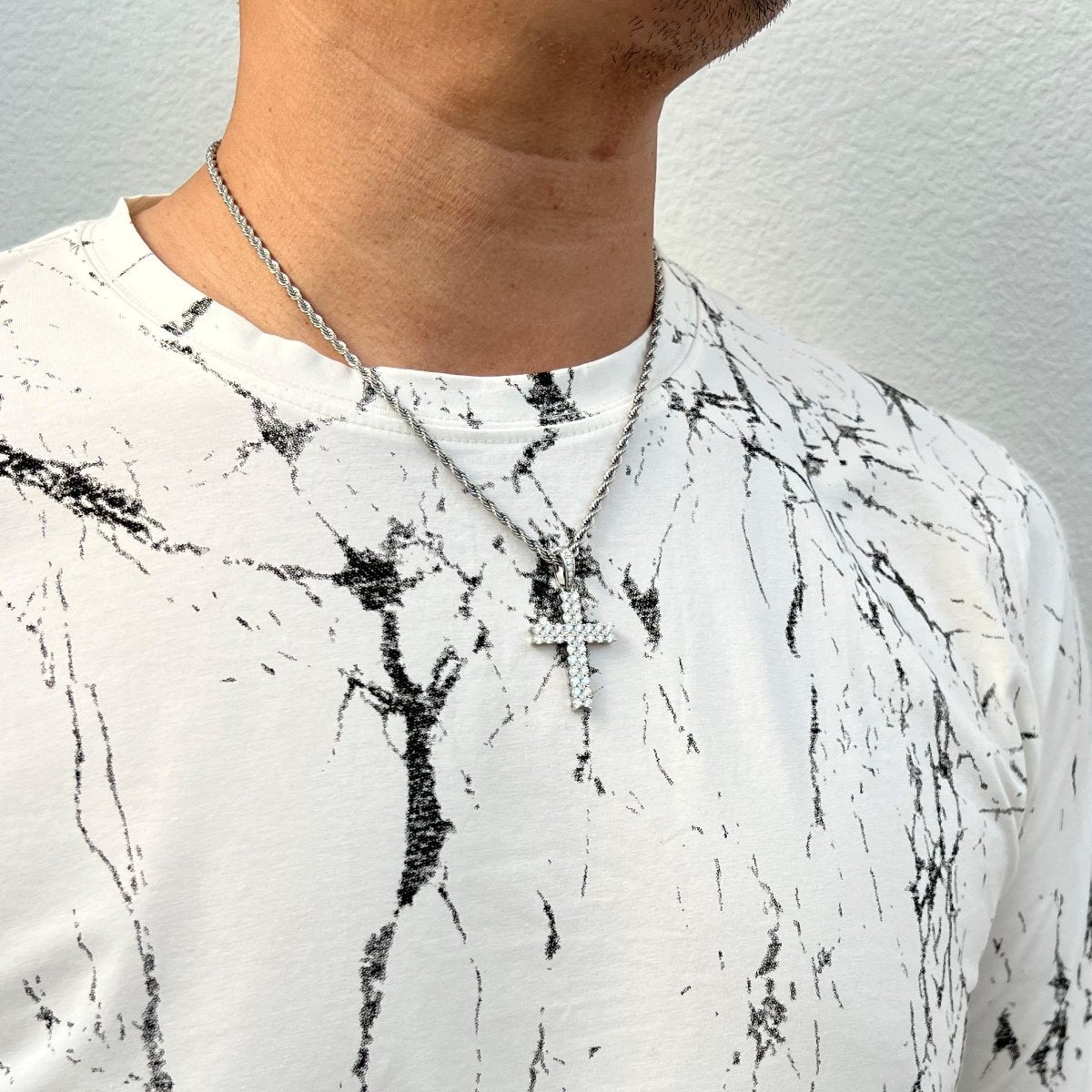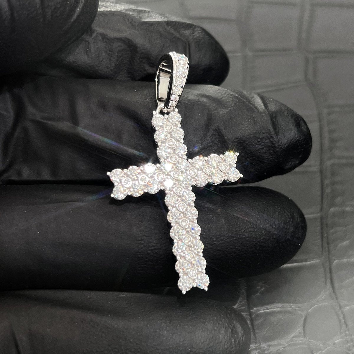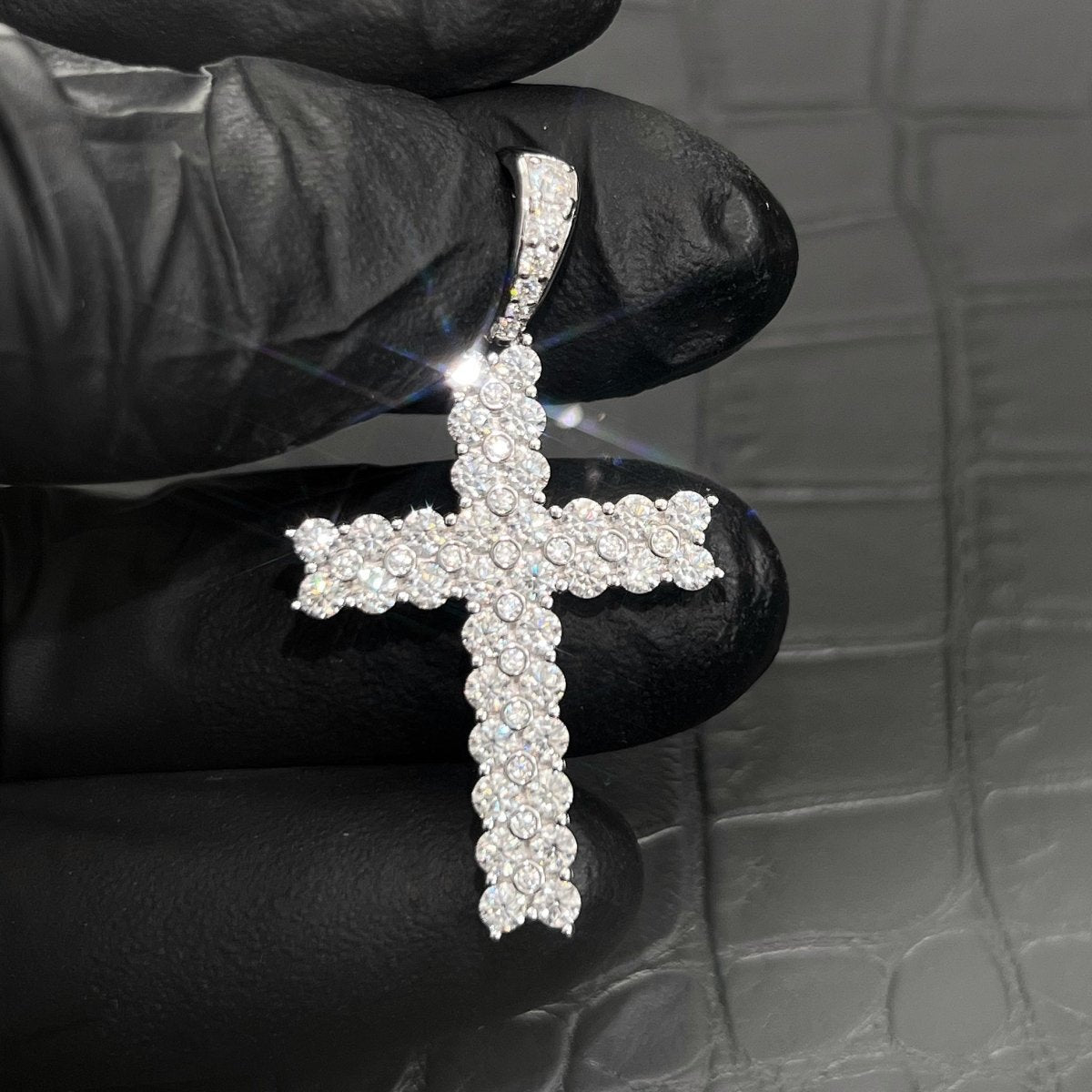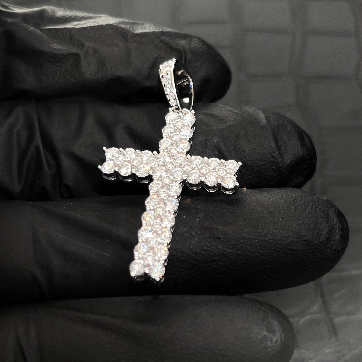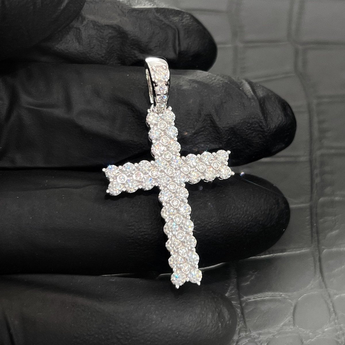 This is the iciest cross design with 2 rows of moissanite and even the prongs are iced! It's the perfect small size for daily wear. It's hand crafted out of real 925 silver with VVS moissanite stones.
