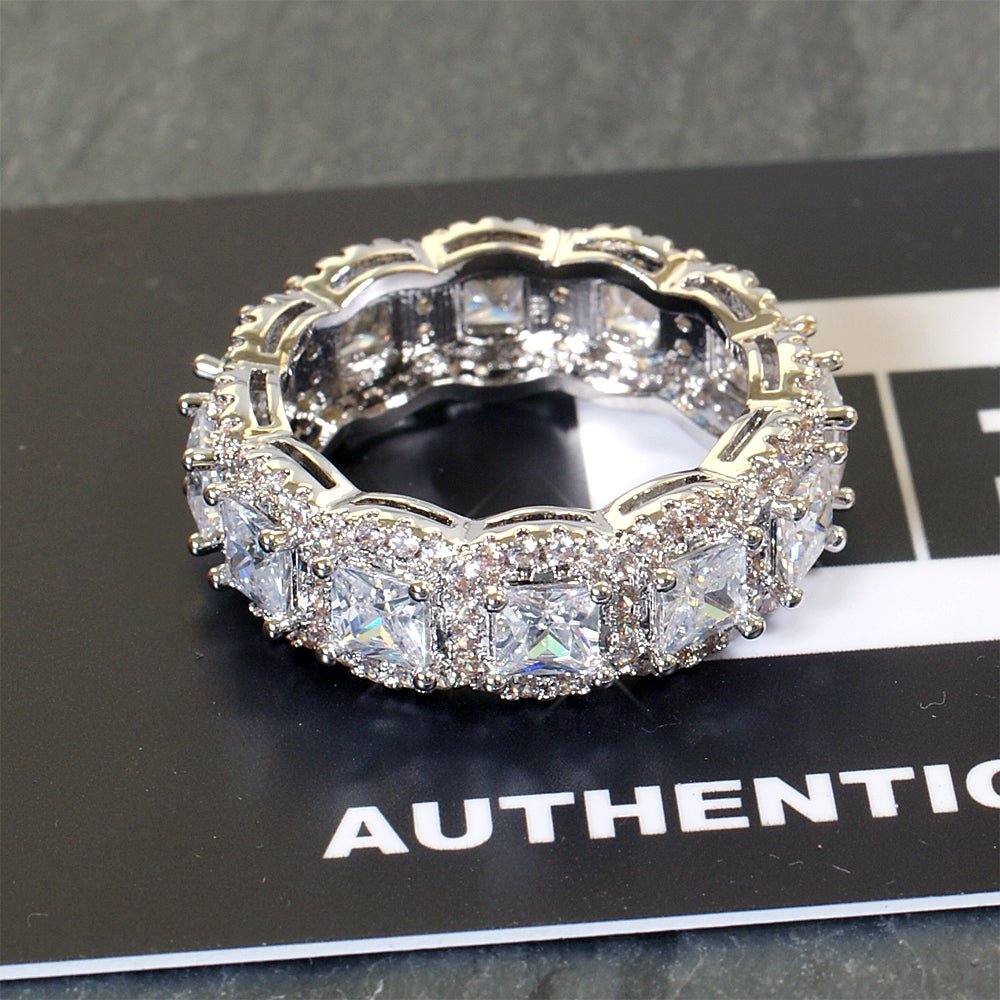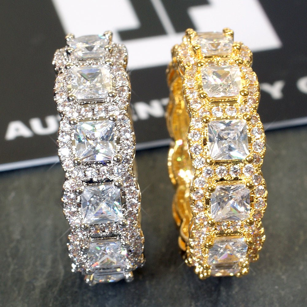 This head-turning luxury ring will give you the look of success. It's mounted with a row of princess cut flawless simulated diamonds and each one is surrounded by a halo of glistening tiny stones. Most sizes feature over 5 carats of ice. Everything is made by master jewelers to the highest quality with genuine 925 sterling silver. Order yours today!