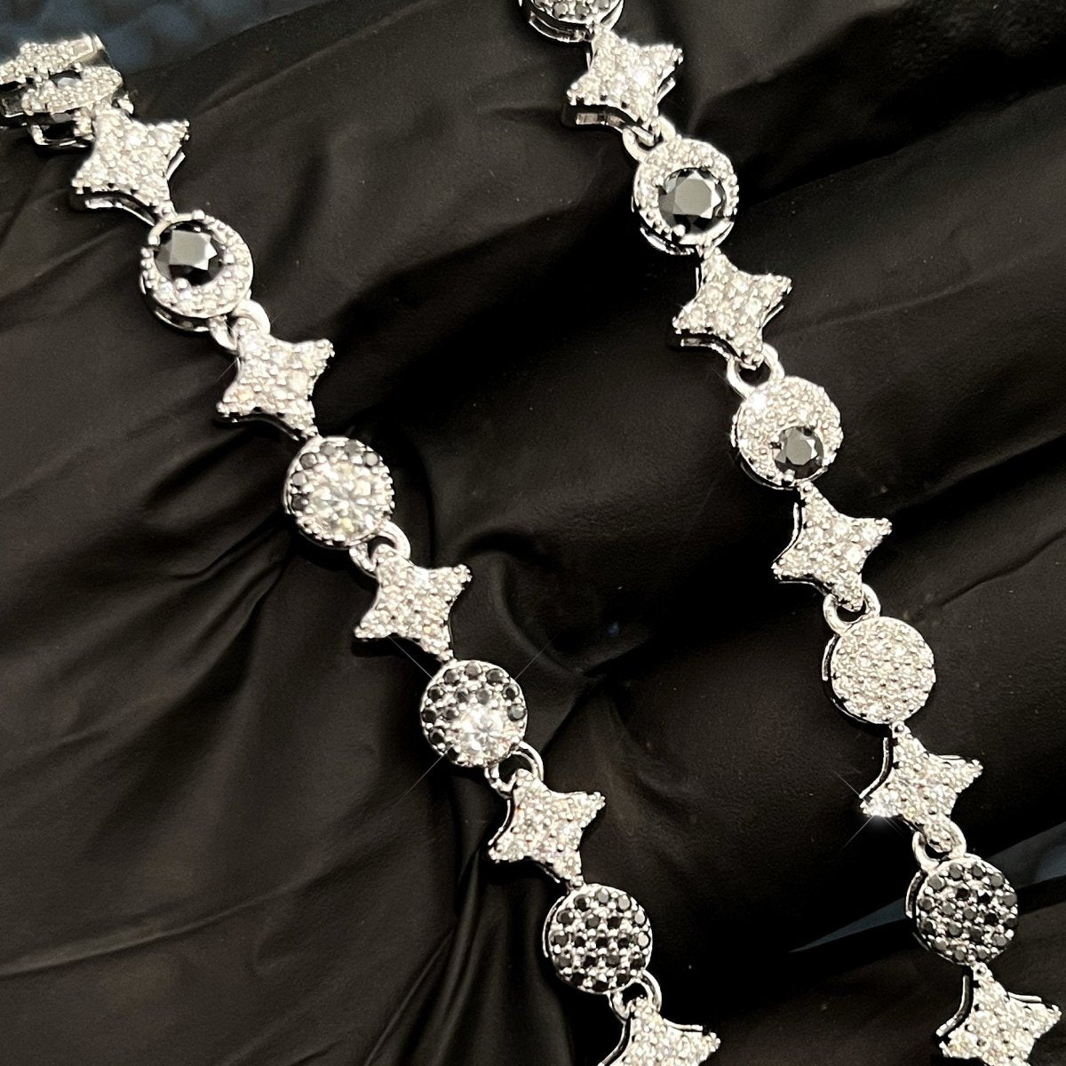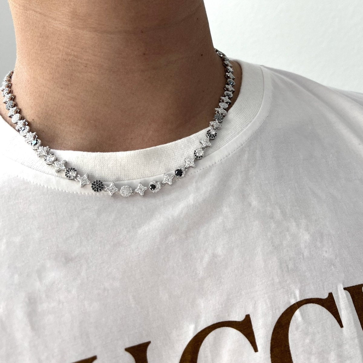 This unique chain features black and white stones create moon and star shapes throughout. This piece is made out of solid 925 silver sterling with rhodium plating. Exact look of white gold without costing $10,000+. The stones are top quality moissanite with better brilliance than any other gemstone in existence. Moissanite has 9.5 hardness rating out of 10 (Diamonds are 10, most fake stones are only 3-4) That means moissanite is near impossible to scratch and won't lose shine. They look virtually identical to expensive diamonds and passes commonly used diamond testers.