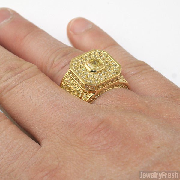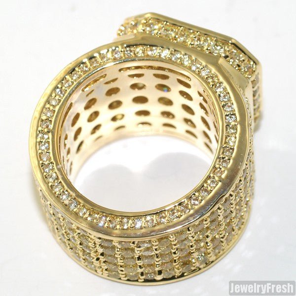 This ring is made out of solid brass and features thick plating with clear coat. All stones are lab made VVS Flawless simulated diamonds. Each stone is micropave prong set by hand by experienced master jewelers. The ring has a caged back with breathing holes for maximum shine. Order yours today!