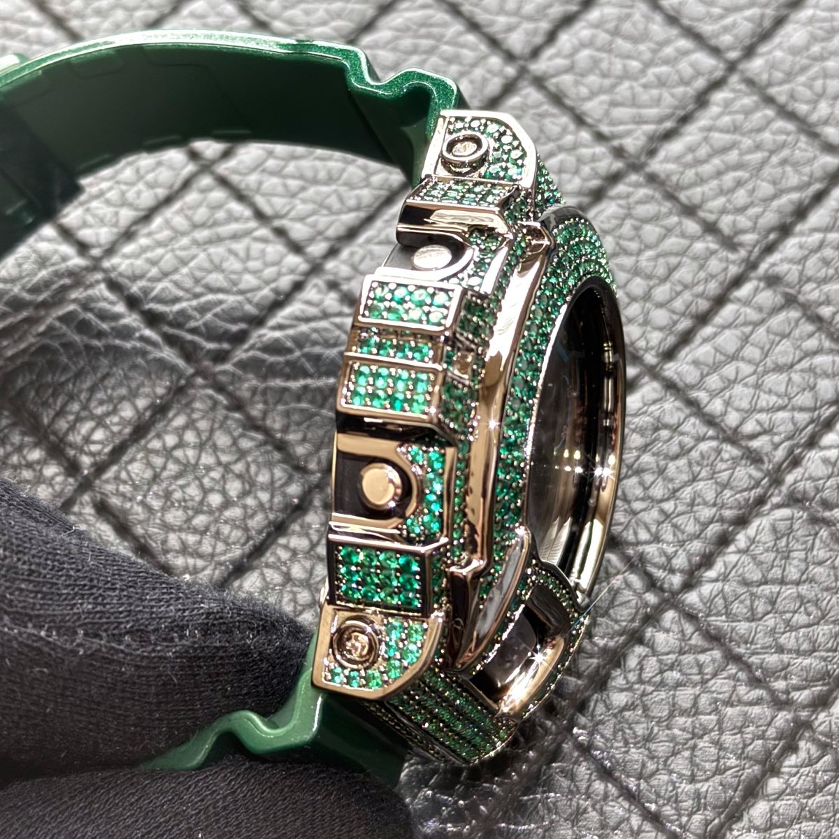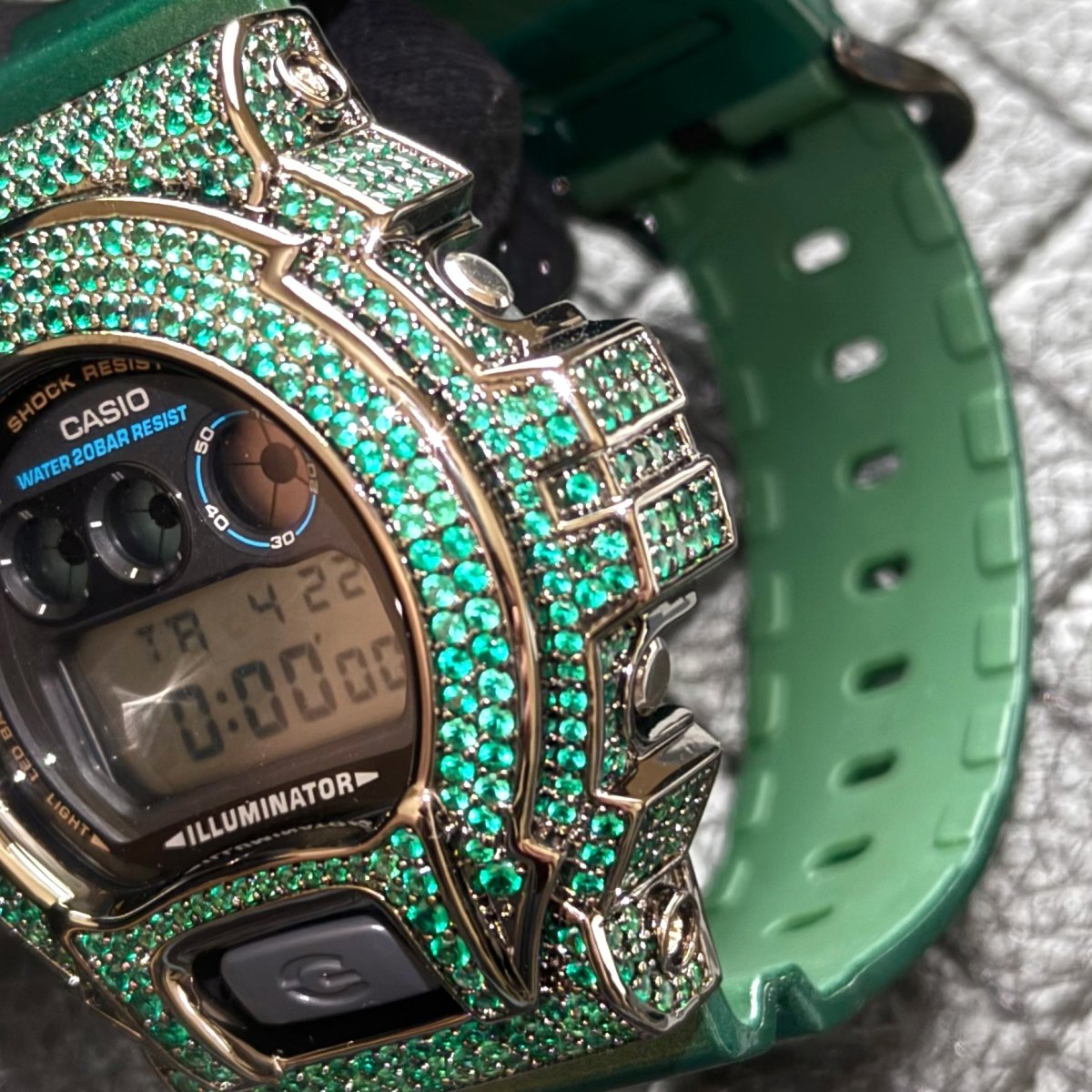 This is JewelryFresh exclusive one of a kind G-Shock. It's fitted with an emerald green colored iced out bezel with gloss strap and matching black metal buckle. Turn heads everywhere with this iconic streetwear watch!