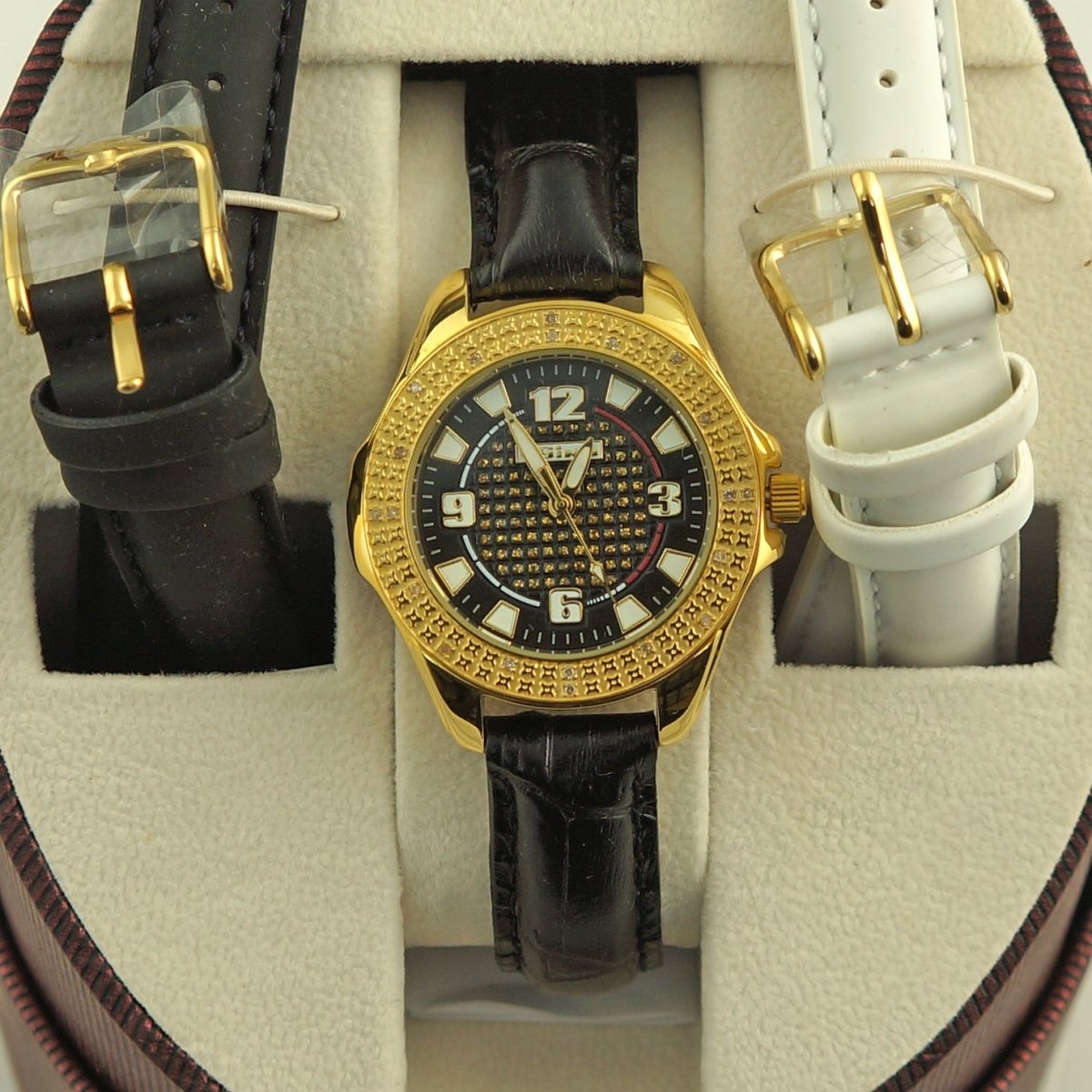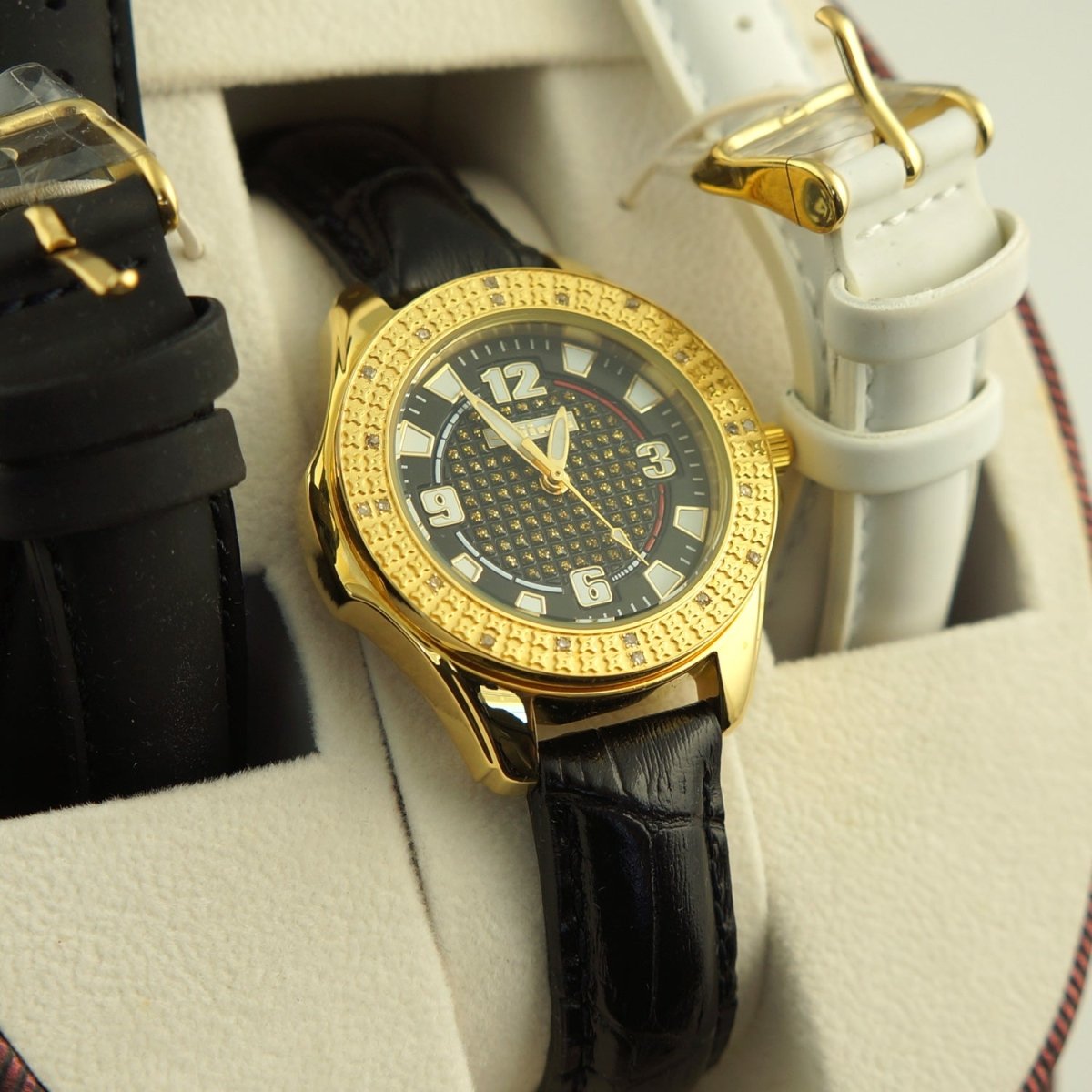 This impressive designer watch will look great for any occasion. The bezel is set with 100% natural real diamonds. It comes with 2 extra bands so you can change it in seconds and get the look of 3 watches in one. Authentic Jojino by Joe Rodeo watch complete with box and papers. Highly limited at this special price. Order yours today!