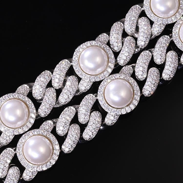 Get the look of royalty with this large 17mm heavy cuban chain. Not only is it hand set with over 34 carats of VVS1 clarity moissanite, it also features large synthetic pearls throughout for a truly unique look. Order yours today!