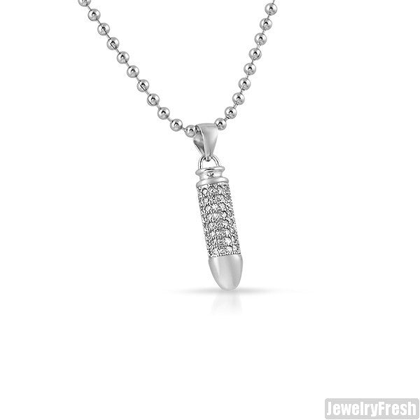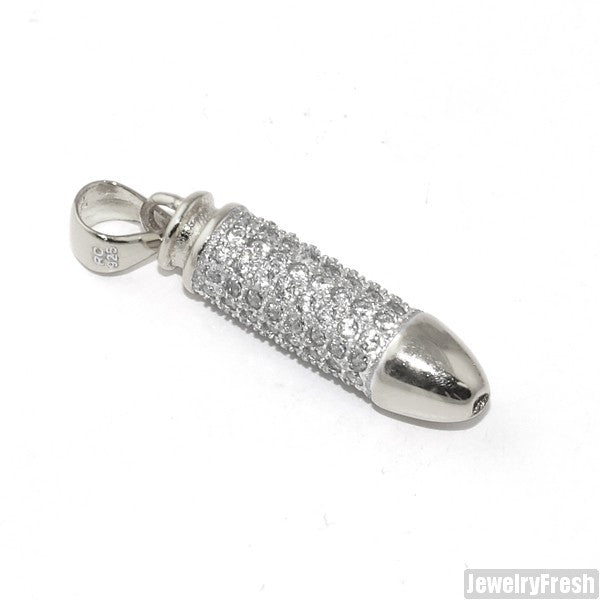 This is a tiny bullet pendant. Good for women or guys who want something very small and subtle. All stones are small sized VVS flawless simulated diamonds. These lab created stones are micropave prong set for an incredible glisten and shine. The pendant is made out of solid 925 silver. It comes with a 2mm 36 inch stainless steel bead chain. You can cut it down to any length you want when you receive it. Order yours today!