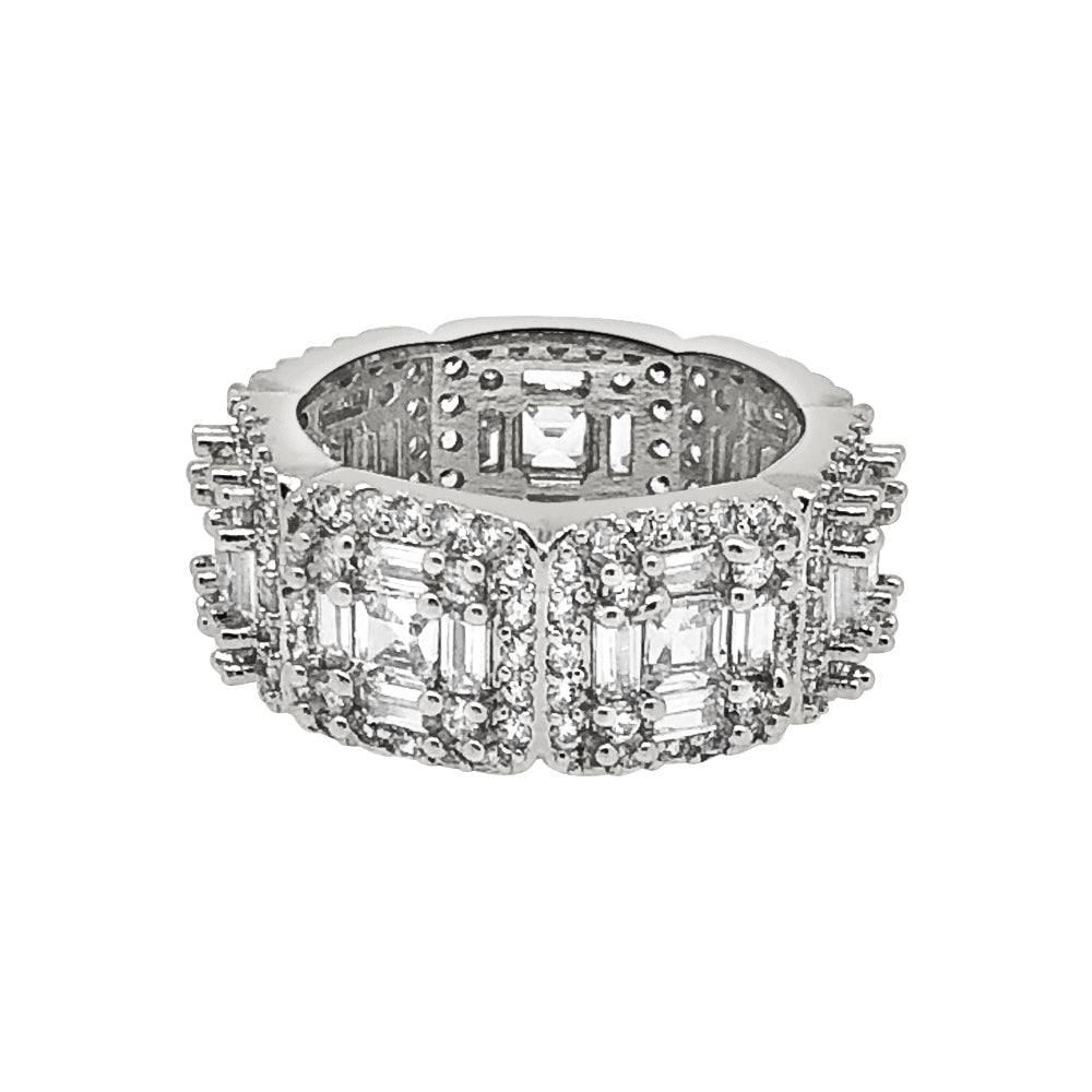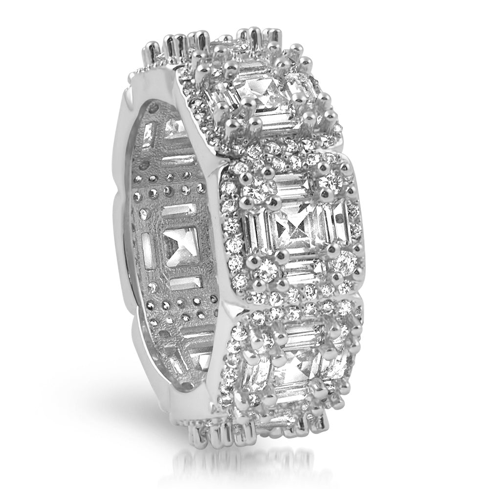 Turn heads and flex hard with this clean but icy 360 ring. Nothing like it is our there. Every link is has an asscher cut stone surrounded by baguettes with a round stone border. This ring is made with top quality European machine cut simulated diamonds. These fine quality stones shine like an expensive piece of jewelry. Every stone is prong set by hand. This ring is made out of genuine sterling silver and it will never turn colors. Order yours today.