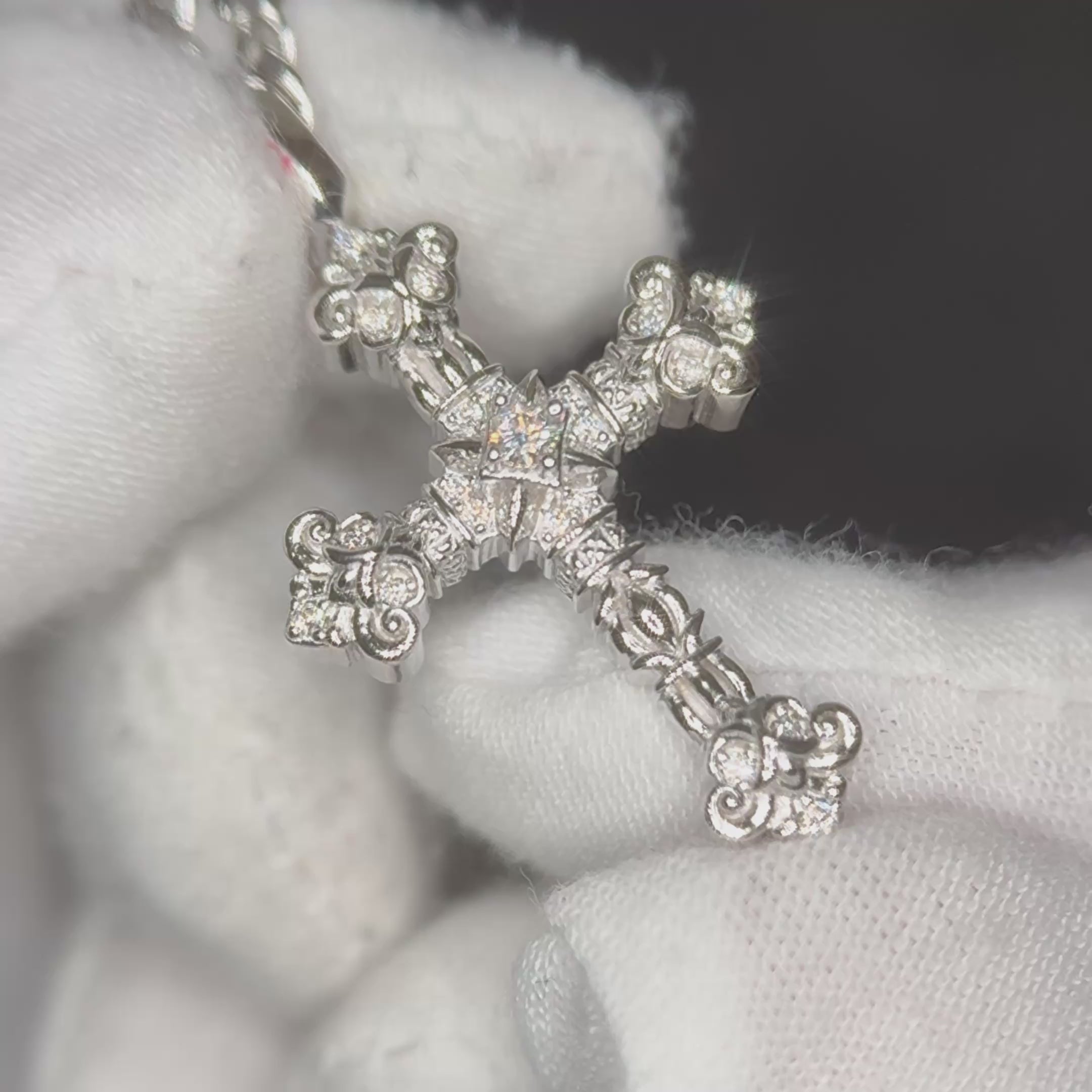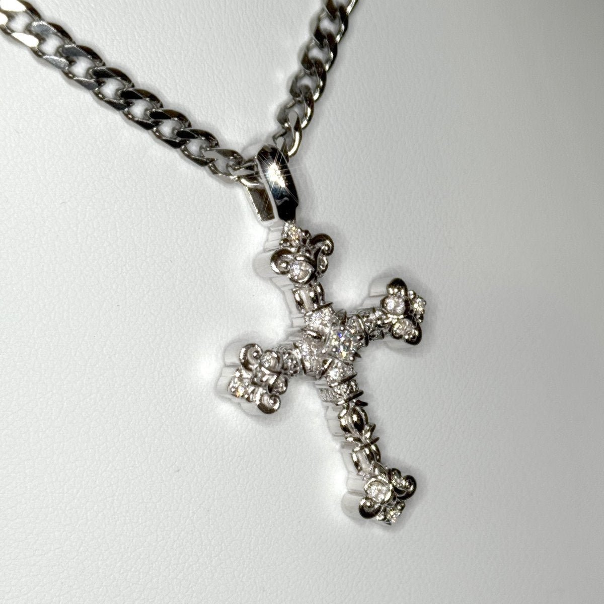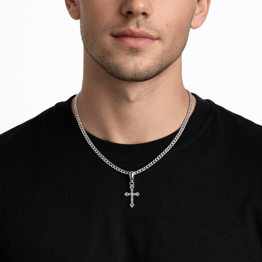This small sized cross is packed with stunning detail and shine. This genuine sterling silver cross features fluted raised edges, hand finishing and prong set stones to set it off. Includes our 3mm 20 inch stainless steel cuban chain.