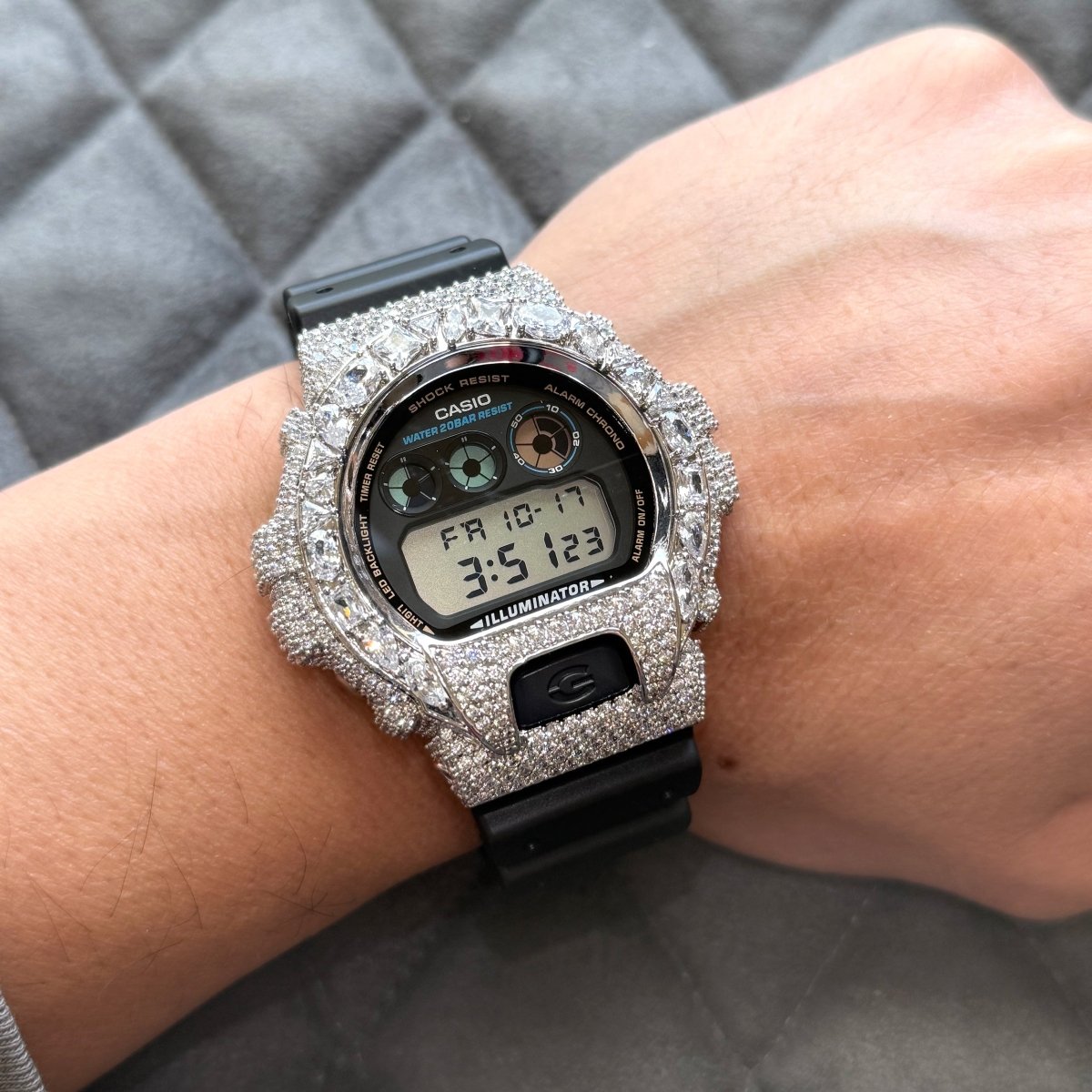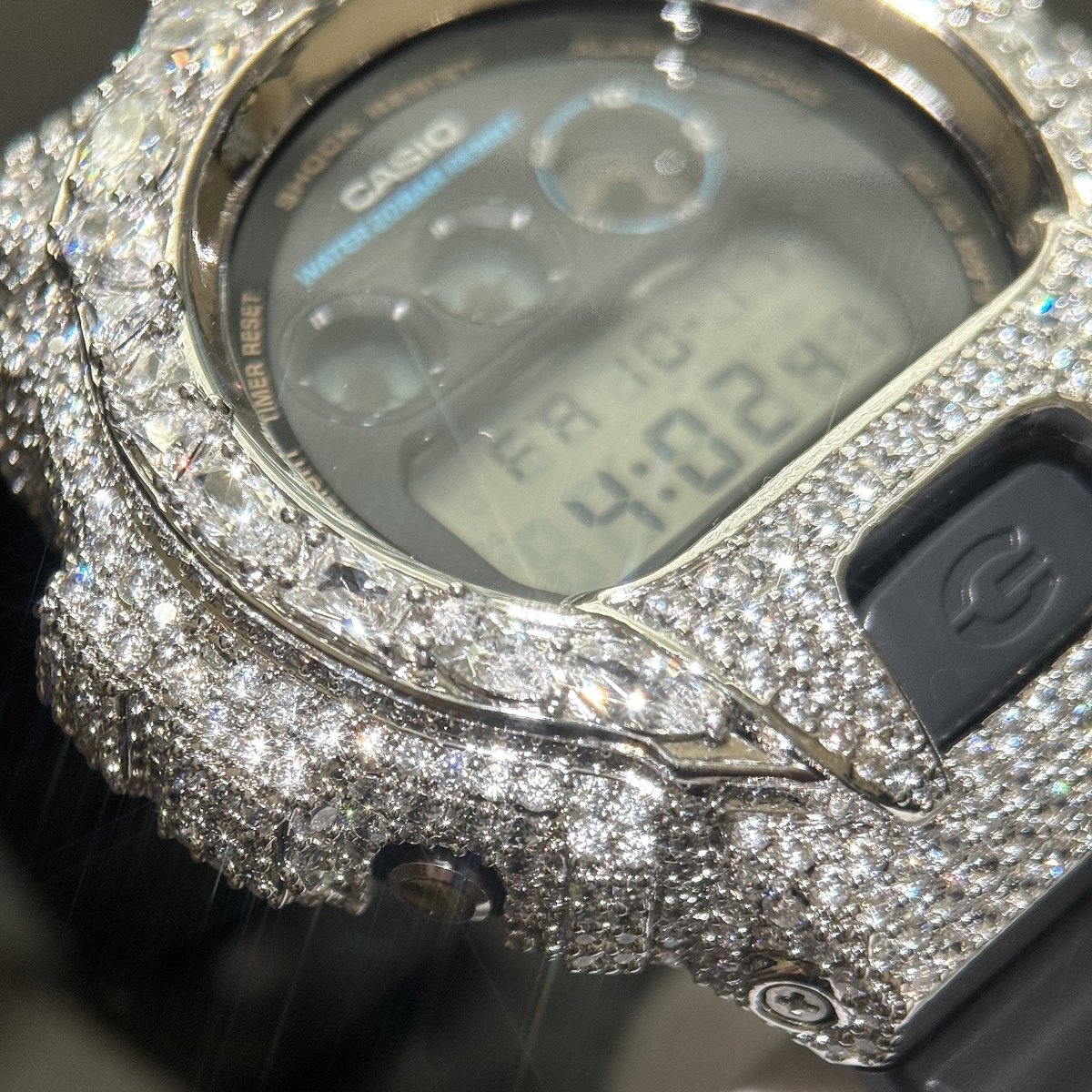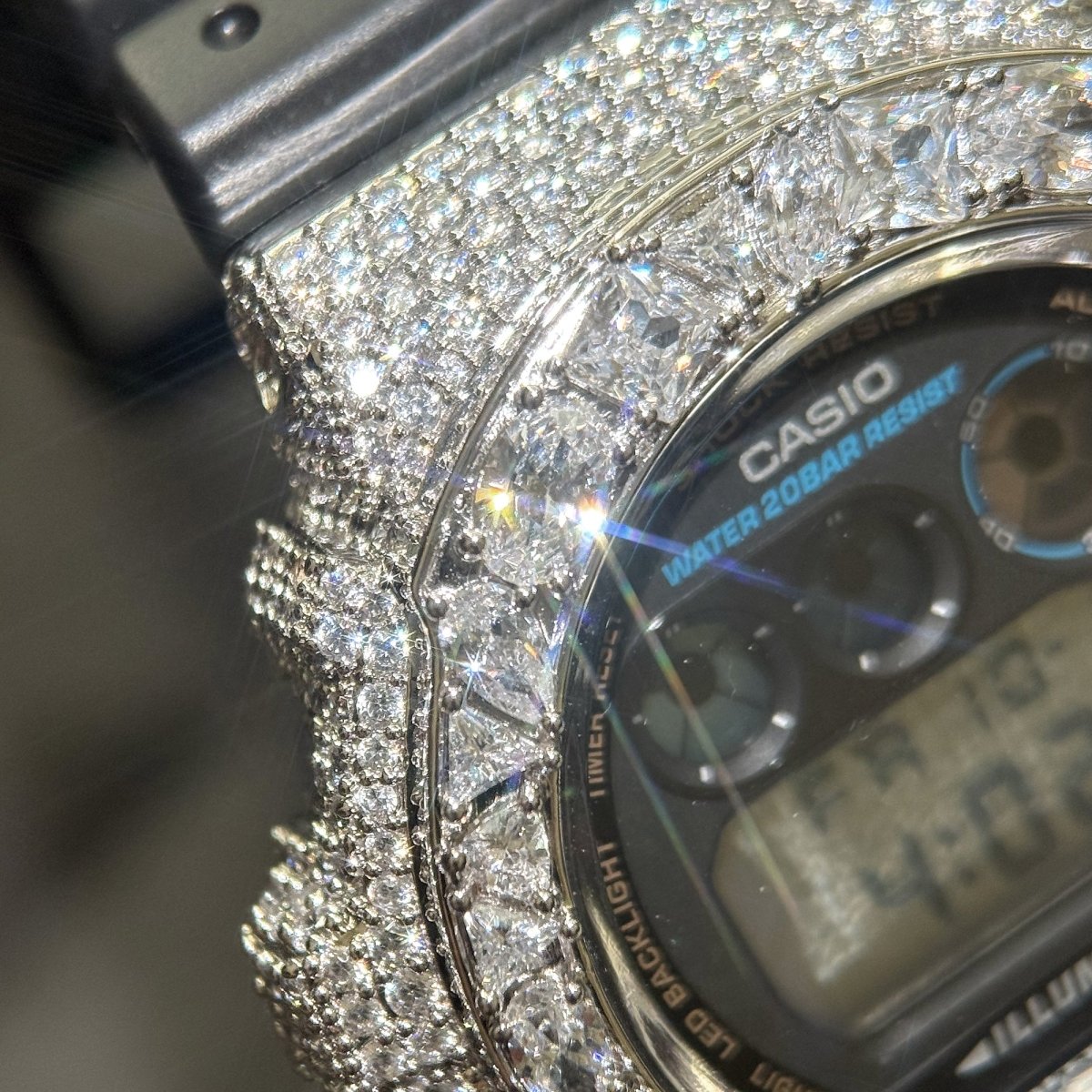 This is JewelryFresh exclusive one of a kind G-Shock. It's fitted with a hand set multi-cut iced out bezel that makes it glisten like crazy! You get almost every single type of diamond cut on one watch. Turn heads everywhere with this iconic streetwear watch!