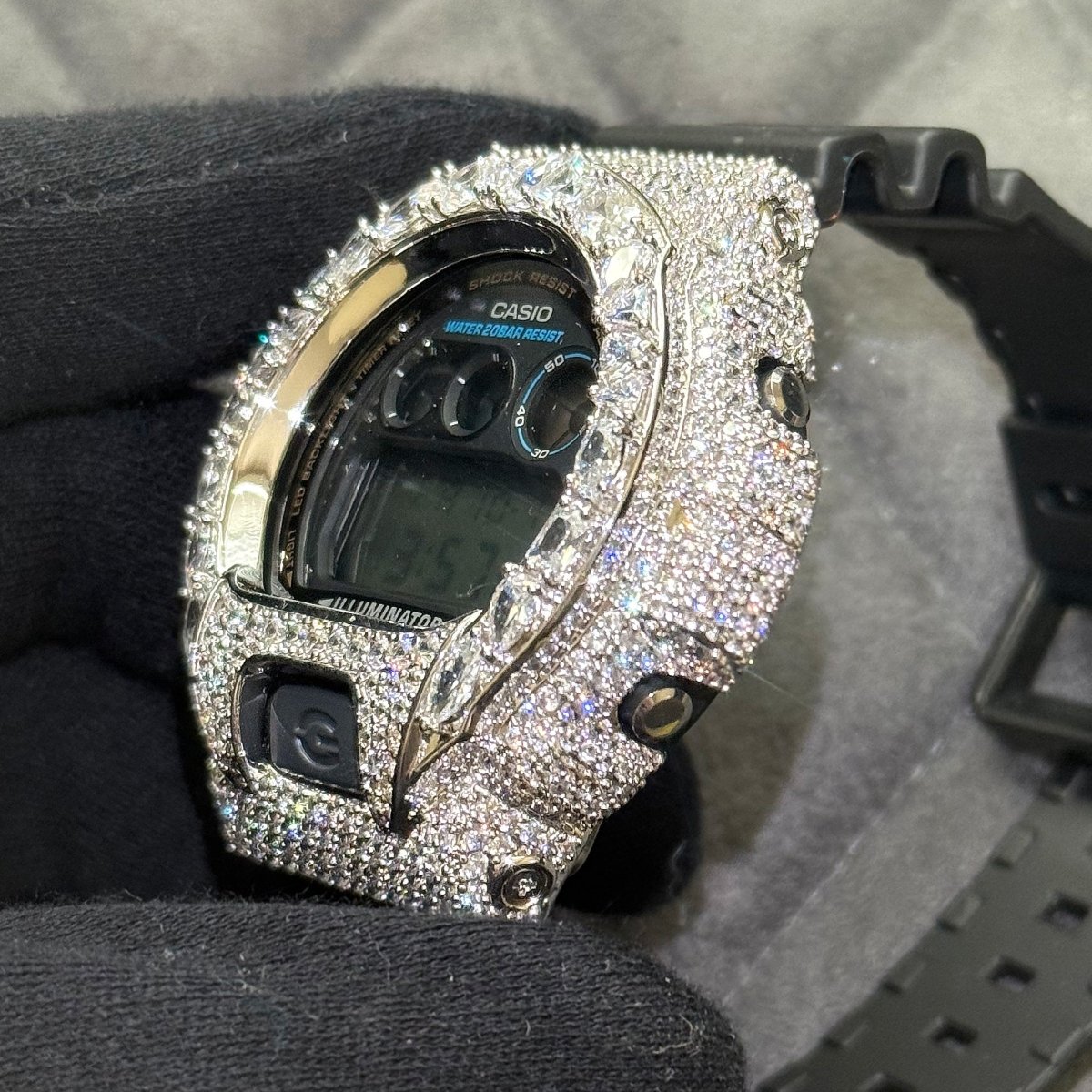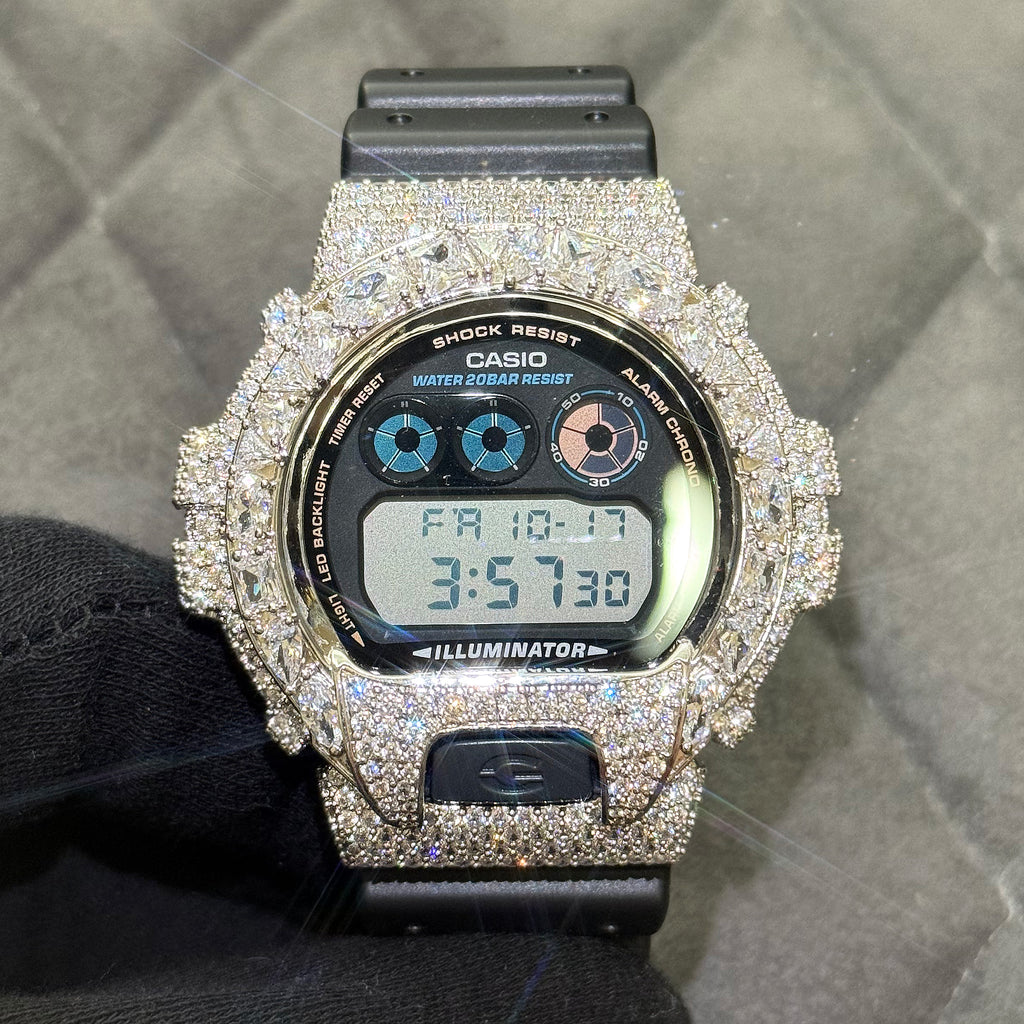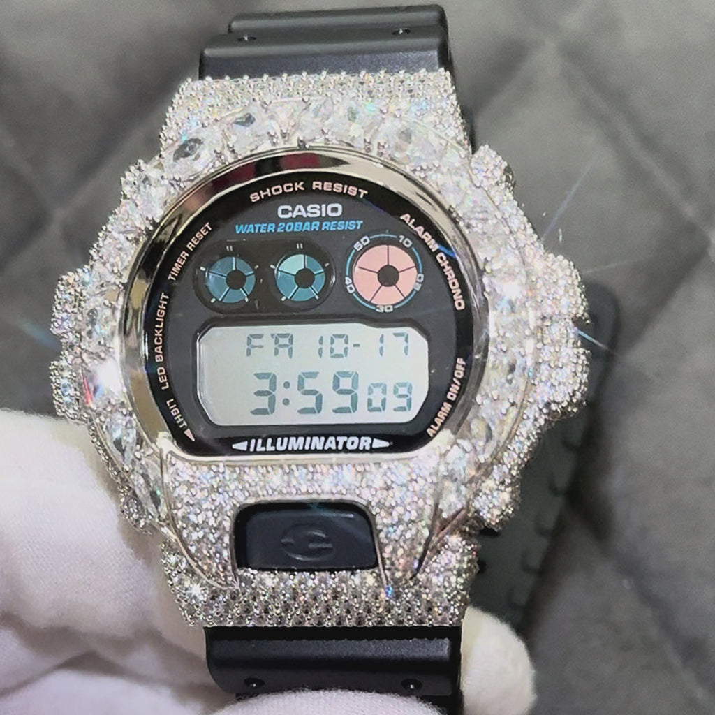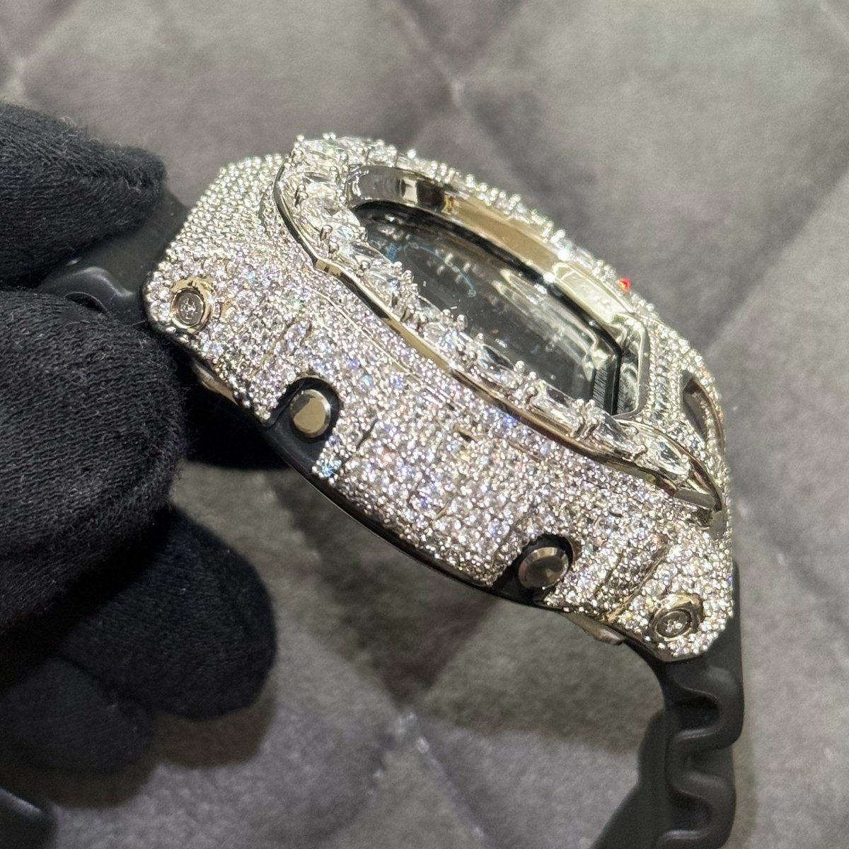 This is JewelryFresh exclusive one of a kind G-Shock. It's fitted with a hand set multi-cut iced out bezel that makes it glisten like crazy! You get almost every single type of diamond cut on one watch. Turn heads everywhere with this iconic streetwear watch!