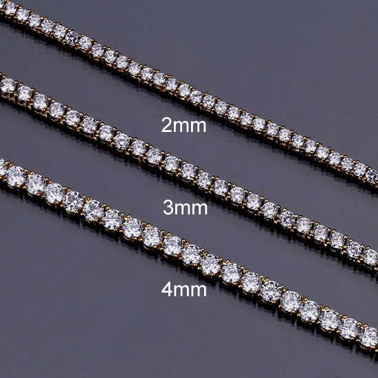 Our top quality colorless moissanite hits harder and outshines everything. They have more fire and brilliance than CZ and any other fake diamond. Visually, they look identical to expensive VVS diamonds. Moissanite has a hardness rating of 9.25 out of 10 and tests positive as a diamond on most handheld testers. Real natural diamond tennis chains cost anywhere from $10,000 - $20,000+ for larger stone versions. Get the same experience for less.