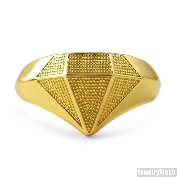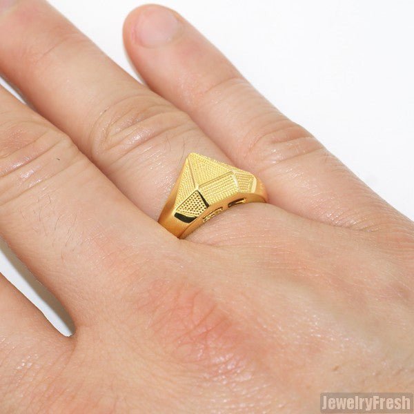 This awesome diamond shape ring features lots of details and texture. It is a 3D design made out of genuine 925 silver dipped in 14K gold. All the finishing, detail and metalwork is down by master jewelers for true perfection. Order yours today!