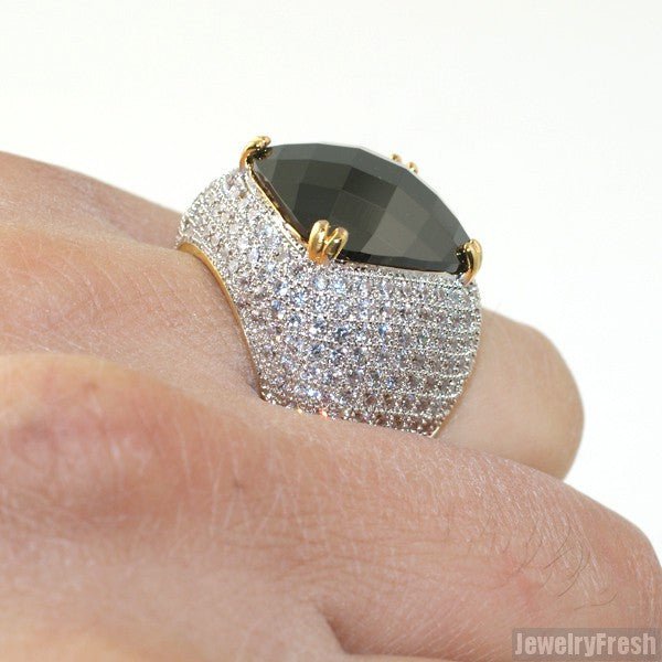 This is a one of a kind masterpiece. It features a jumbo 10 carat rose cut black simulated diamond held by double prongs. It is surrounded by a sea of glistening smaller sized stones. Order now and rock this in just a few days!