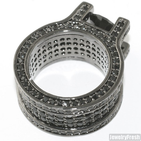 This ring is made out of solid brass and features thick plating with clear coat. All stones are lab made VVS Flawless simulated diamonds. Each stone is micropave prong set by hand by experienced master jewelers. The ring has a caged back with breathing holes for maximum shine. Order yours today!