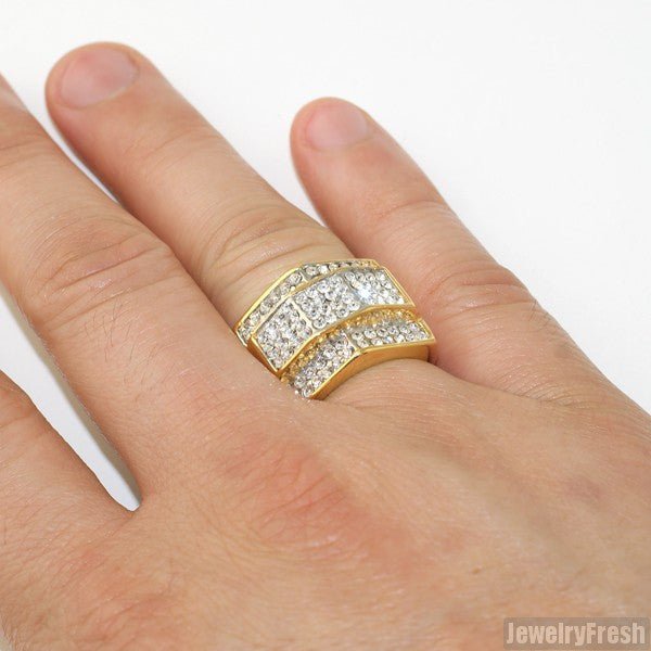 This awesome mens ring is made out of solid stainless steel. Its stronger than real gold or platinum but costs alot less. Genuine 100% real Czech crystals are set onto this ring to give you an amazing shine. The ring has 14K IP gold plating giving you the look and feel of a real gold ring. Order yours today!