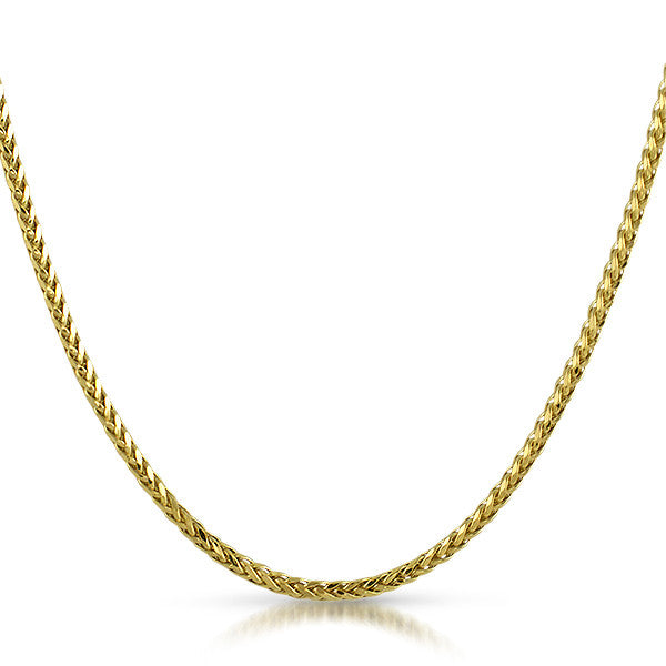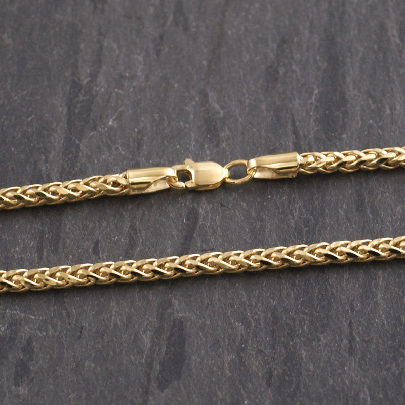 This shiny wheat chain is unique and always in style. This stunning chain has intricate links with diamond cut beveled edges for a very high end look. It is hand polished to perfection. The 3mm size is perfect for smaller pendants and everyday wear. Order yours today!