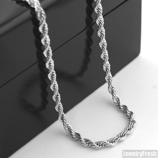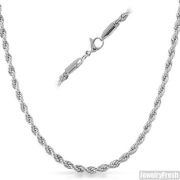 This classic French rope chain is a perfect 4mm size. It works great with smaller pendants or a standalone chain. Matching bracelet is available. It is made out of solid 316L stainless steel and polished to perfection by our expert jewelry production team. This chain will never tarnish. It looks and feels like real platinum.