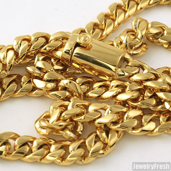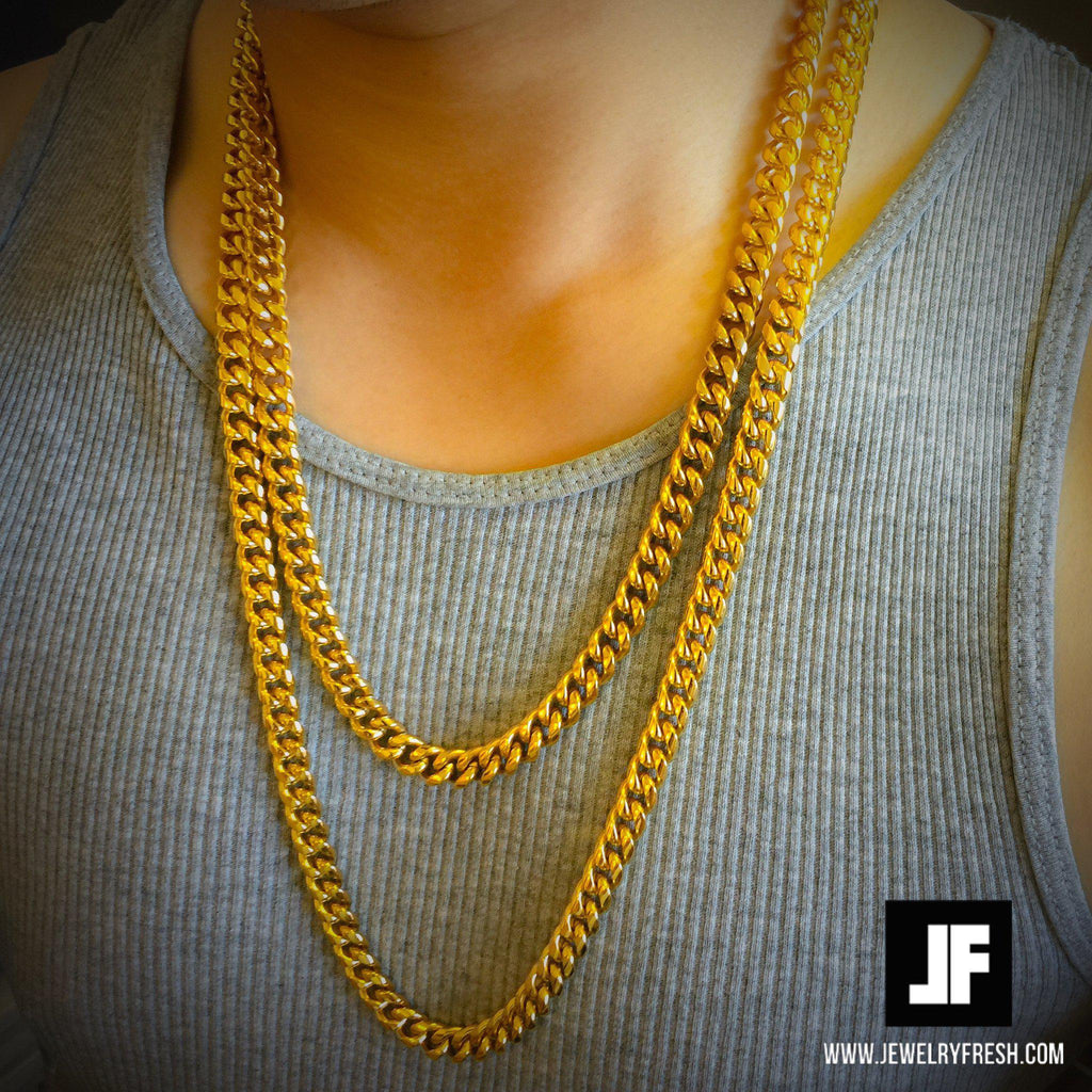 The hottest cubans in the jewelry game! These JF luxury edition cuban chains are the best version of the stainless steel cubans. They have the true Miami cuban shape with think rounded links with beveled edges. They are heavy and solid feeling, complete with an oversized box clasp with quick release. These chains are solid 316L stainless steel, same material used to make high end watches. It is triple plated with 14K gold using the IP process, which is the best method of gold plating. This gives you the true look and feel of solid gold without spending thousands. Order yours today.