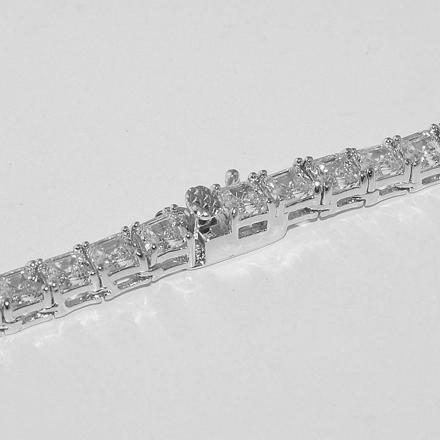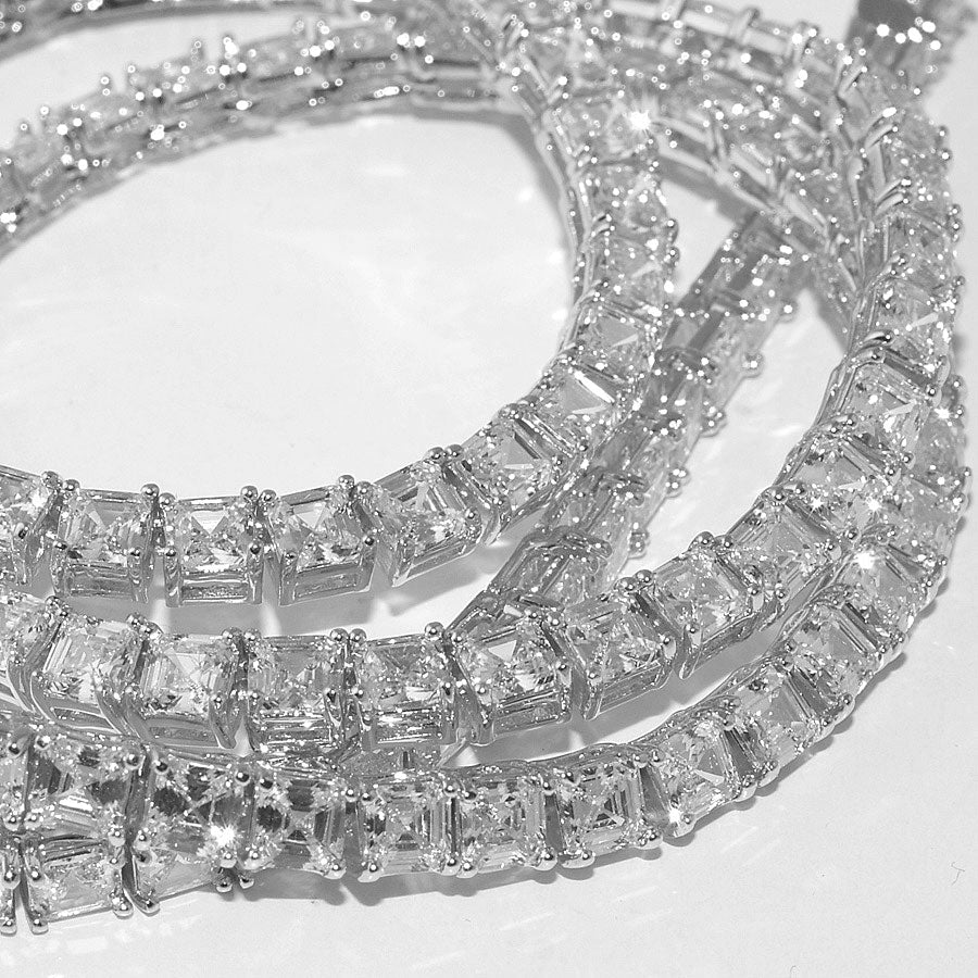 This is a JF exclusive design. These are asscher cut stones, which look nothing like any other types of diamond cuts out there. They are more rare and expensive, and look amazing in person. Set yourself apart with a unique tennis chain like this.