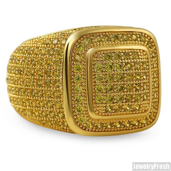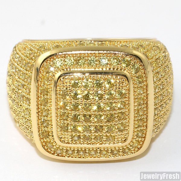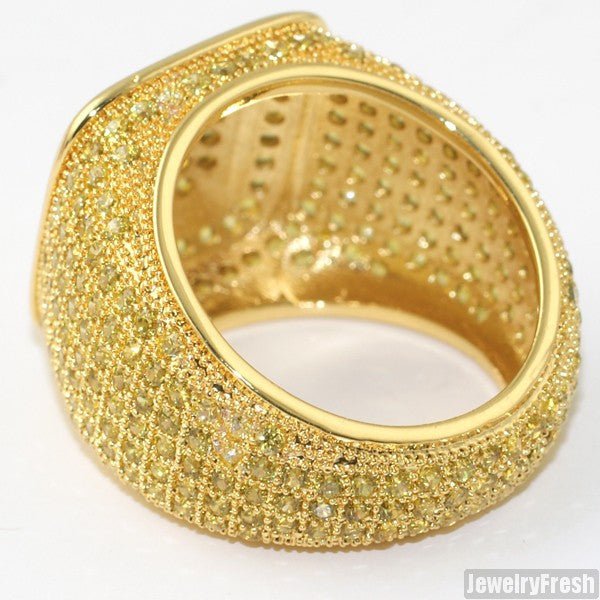 This ring is made out of solid brass and features thick plating with clear coat. All stones are lab made VVS Flawless simulated diamonds. Each stone is micropave prong set by hand with breathing holes for maximum shine. Order yours today!