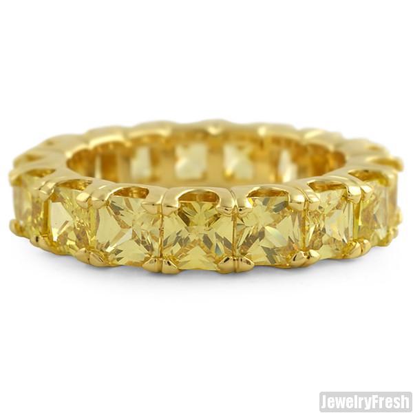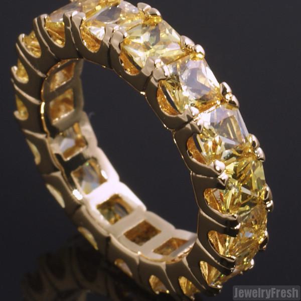 This ring is made out of solid brass with 100 mils of gold plating. The stones are top quality lab created simulated diamonds that shine and sparkle hard. It's made exactly like a real diamond men's ring, with prongs holding each stone and breathing holes on the back side to let light shine through for maximum shine.